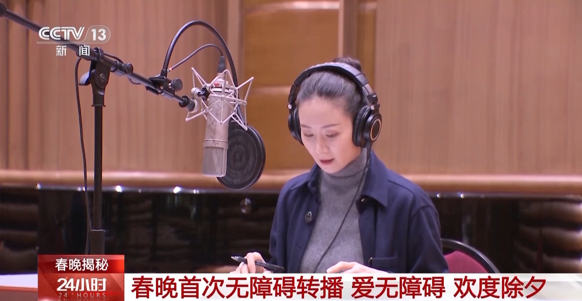 1月23日,在中央人民广播电台的录音棚,青年舞蹈艺术家王亚彬正在进行春晚视障版无障碍转播节目的录制。视障版无障碍转播特邀中国盲文图书馆的口述影像专家撰稿,总台文艺之声、音乐之声主持人一同在直播间为广大听众同步进行春晚转播。青年舞蹈家王亚彬、影视演员孙茜、配音演员凌振赫,以及全国首位视障播音硕士董丽娜等多位艺术家参与解说。这些解说嘉宾根据节目内容、节奏和情感变化,反复调整语速和语调,力求声情并茂地将节目更准确地传达给观众。