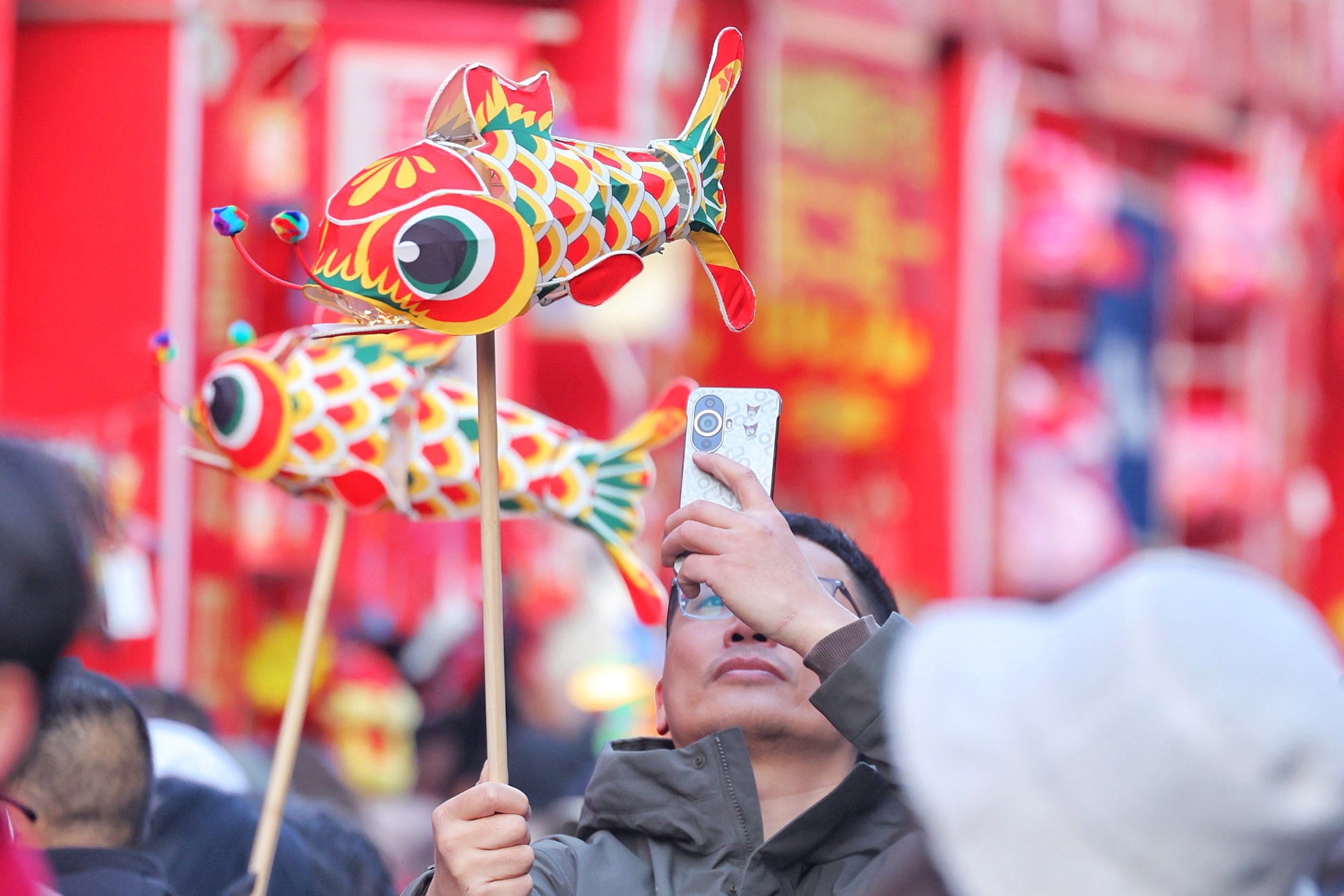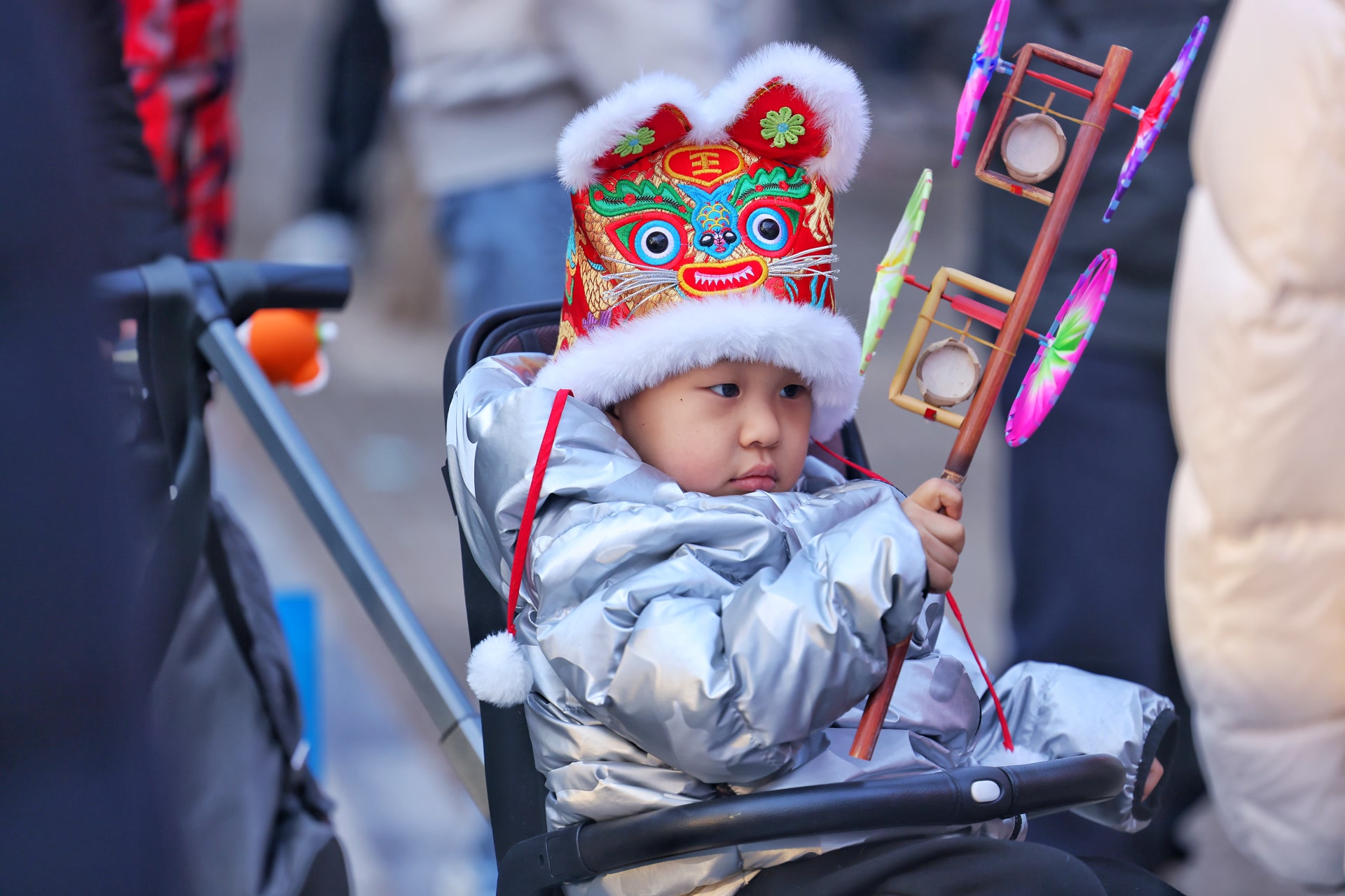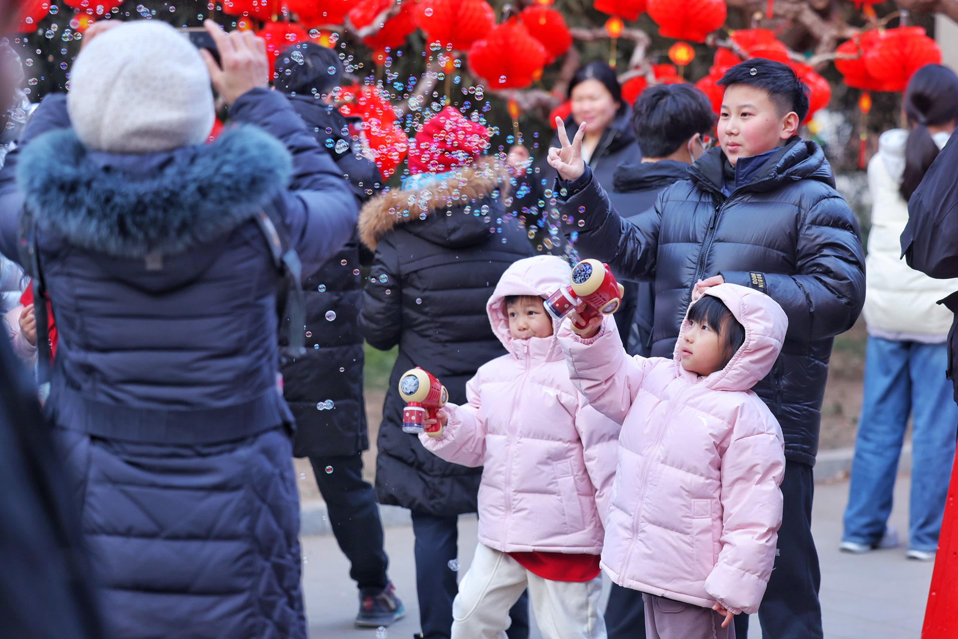 小姐儿俩的泡泡枪为庙会增添喜庆梦幻的年味儿。
