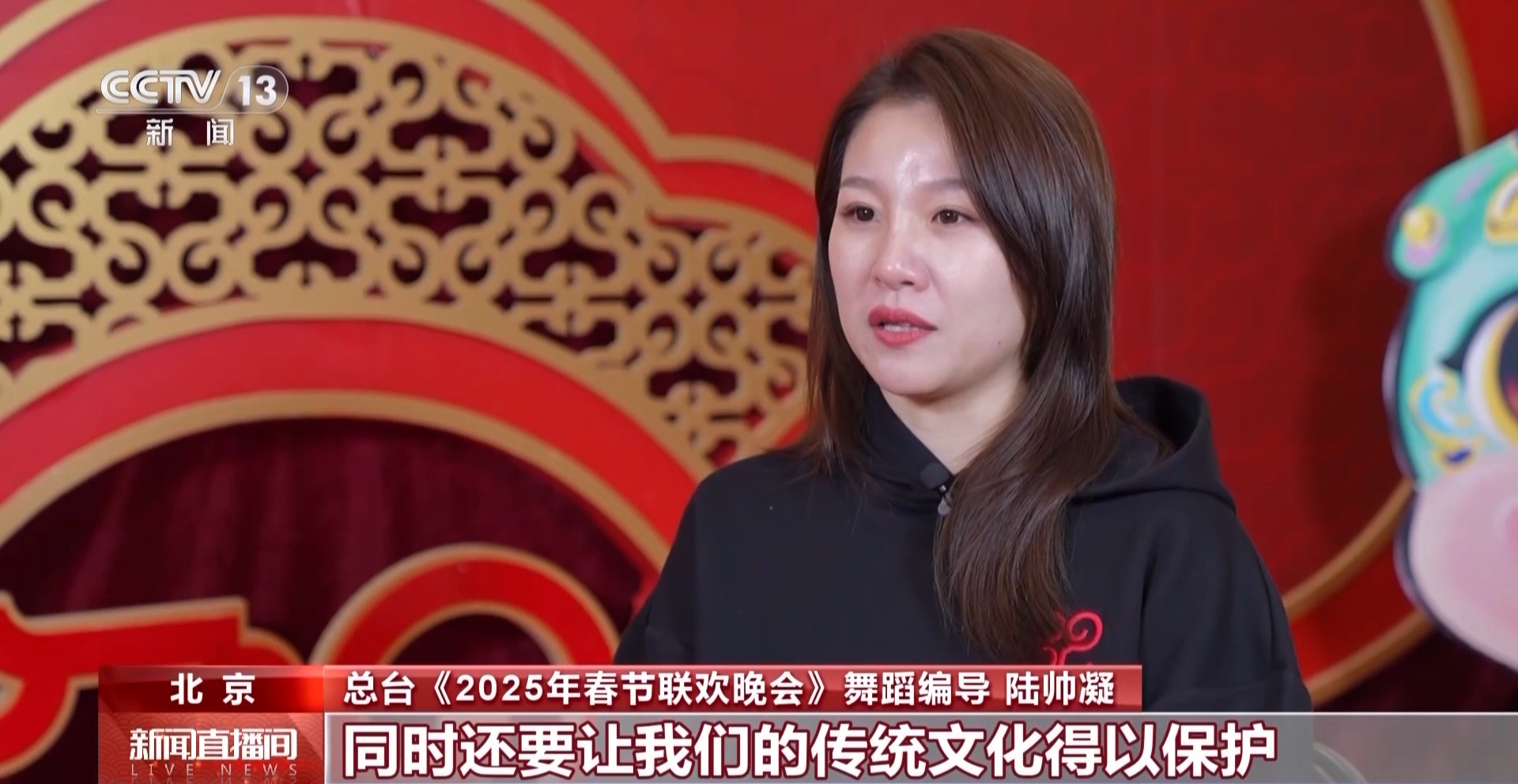 中央广播电视总台《2025年春节联欢晚会》舞蹈编导 陆帅凝:其实各方所有的人都在克服自己的困难,来为一个目标,就是想把传统文化搬到舞台上,同时还要让我们的传统文化得以保护。