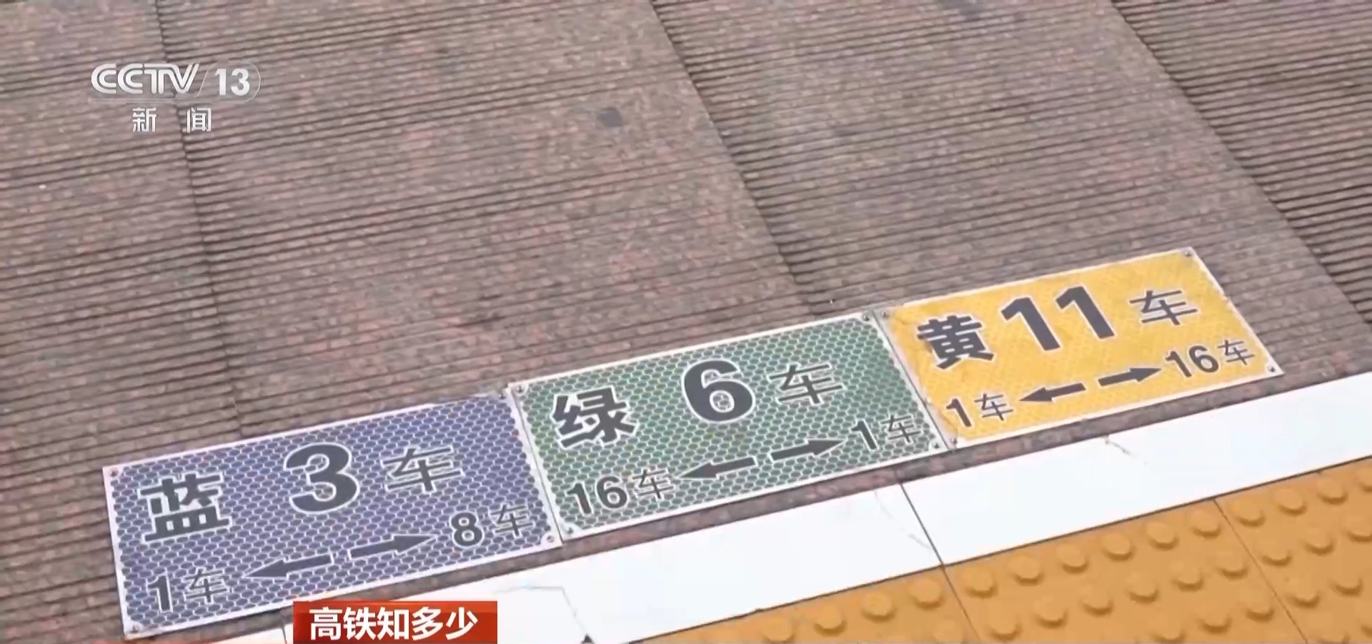 大多数的高铁站台都设置有黄、绿、蓝、紫四种颜色的地标,地标上标注的数字代表列车停靠站台后车厢所在的位置。旅客乘车时,根据站台电子屏上的提示信息,可以找到自己所乘列车对应颜色的地标,快速定位车厢位置等候上车。