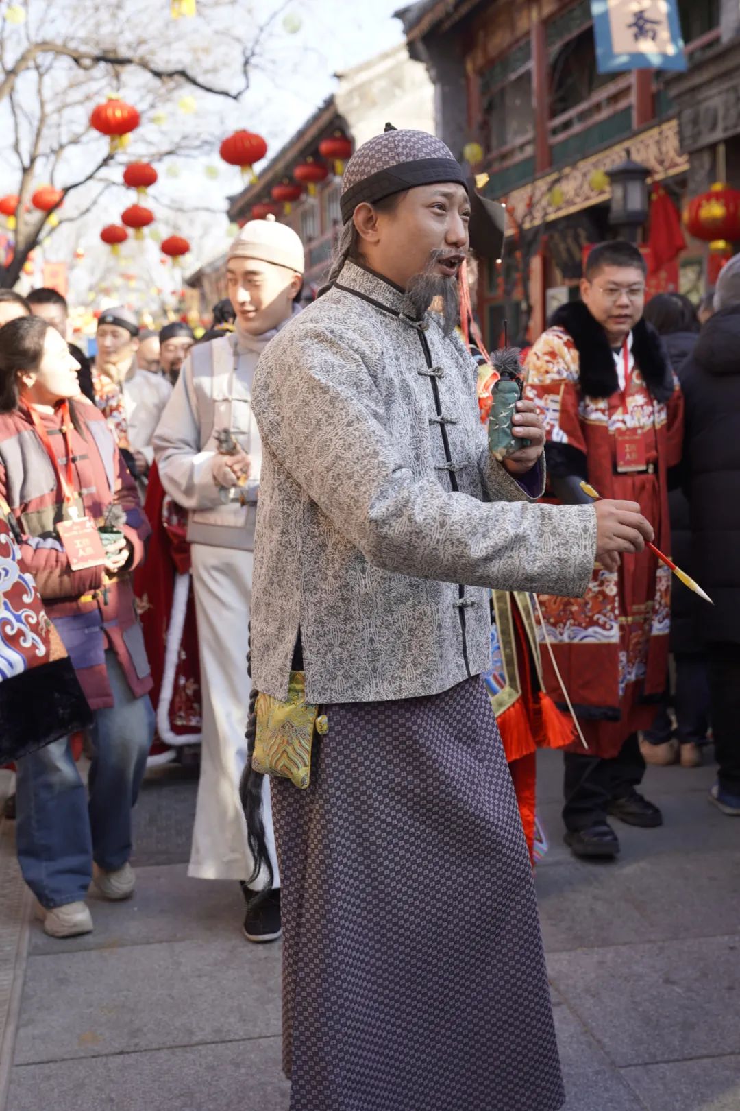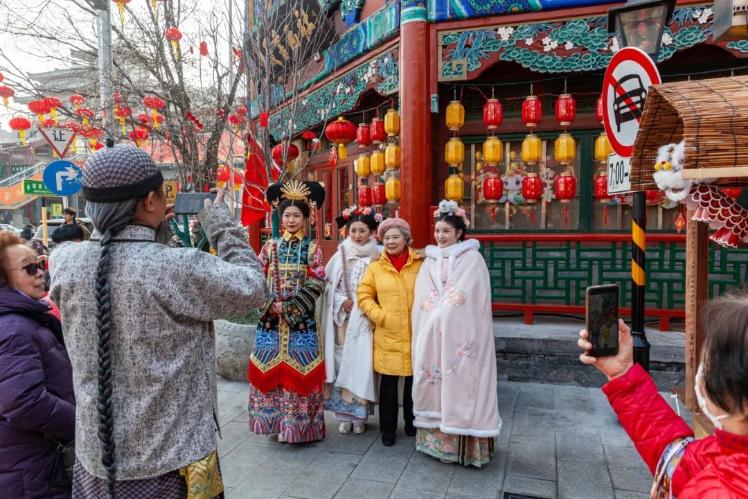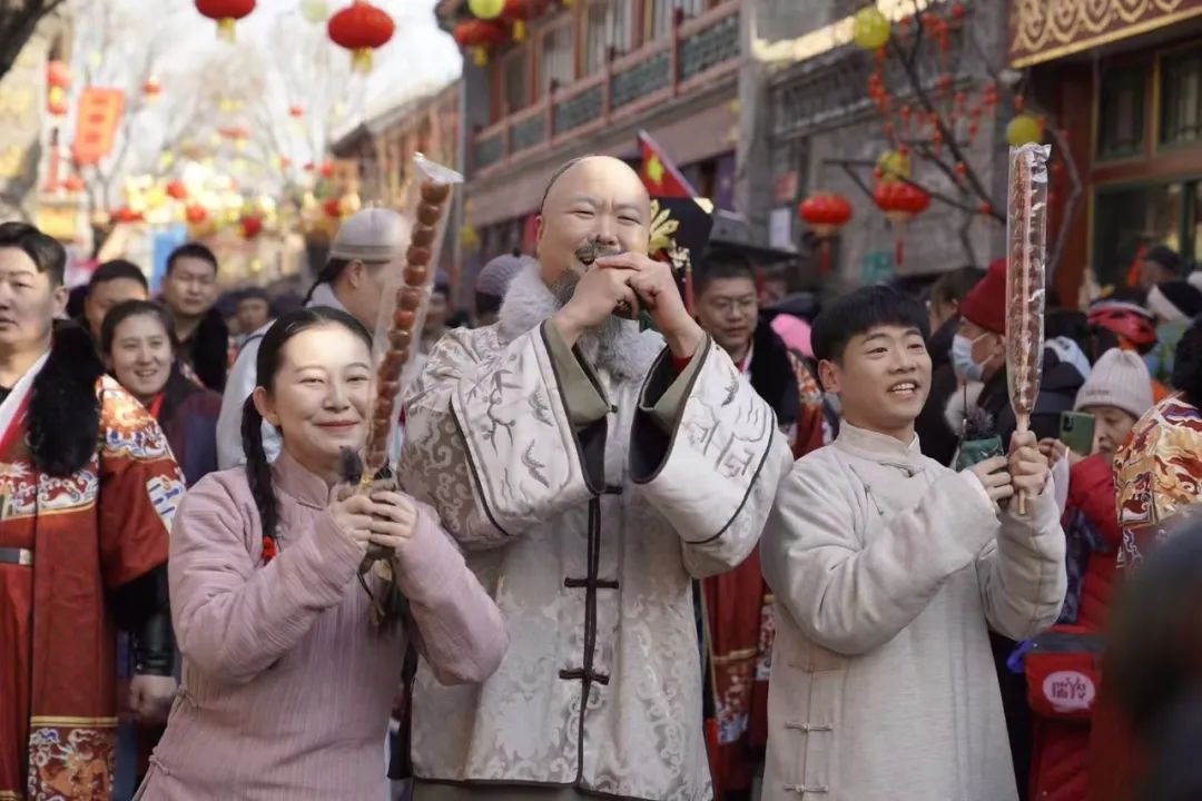 就这样,“宣南往士”们在新春厂甸庙会上组成了史上身价“最古老”的代言团。其间,演员们的表演十分投入,他们不仅模仿了货郎货娘的动作和神态,还热情地与游客们进行互动。当游客们驻足观看时,他们会主动上前,用生动的语言和有趣的动作介绍自己的“宝贝”,引得游客们笑声连连。许多游客纷纷拿出手机,记录下这难得一见的传统风情。