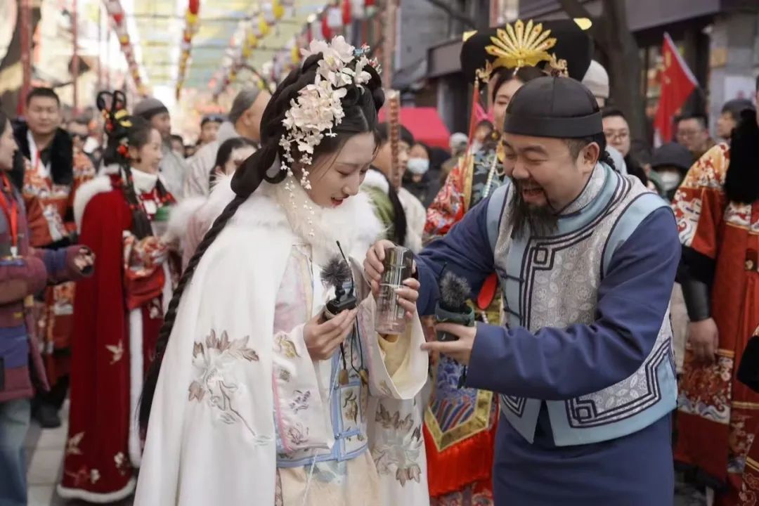 在首个“非遗版”春节,厂甸庙会上一群身着传统服饰的演员格外引人注目。他们就是西城文保剧社“宣南往士”表演团队的成员,庙会现场,他们“变身”货郎货娘,在熙熙攘攘的人群中灵活穿梭,开启沉浸式快闪演出“模式”,为市民游客带来了与众不同的新年“剧”精彩节日体验。