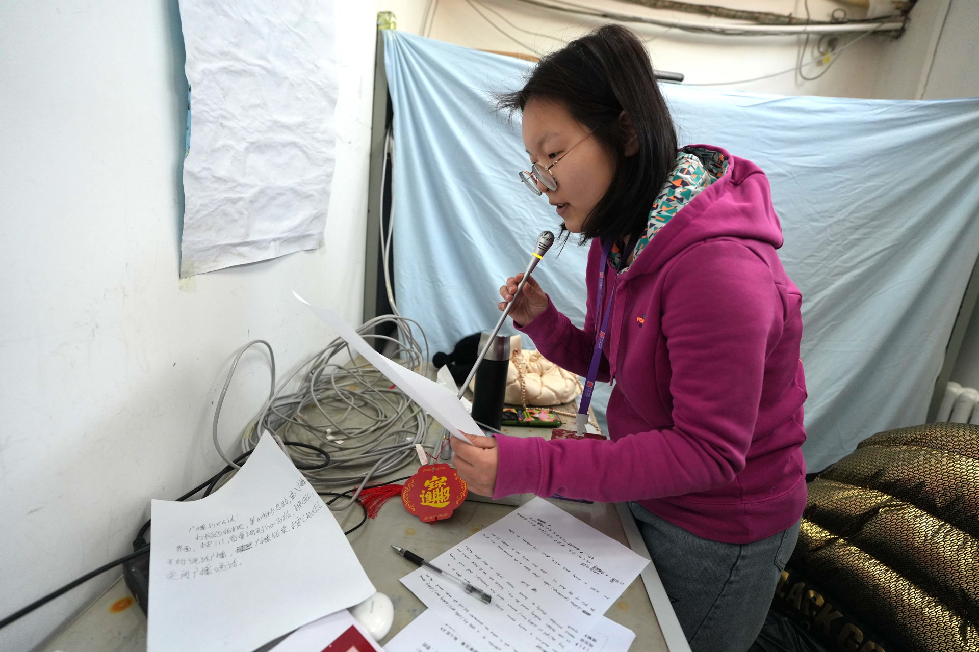 春节假期,贾雨涵天天“上班”。每天庙会开门前,她就会走进地坛公园广播室,为当天的工作做准备。屋子里,一张桌子、一支话筒,还有一张密密麻麻写着各类广播注意事项的纸。