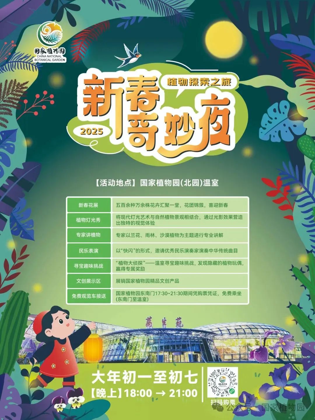 国家植物园东南门17:30-21:30期间凭购票凭证,免费乘坐(东南门至温室往返)。