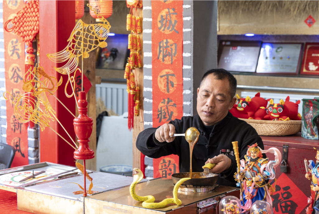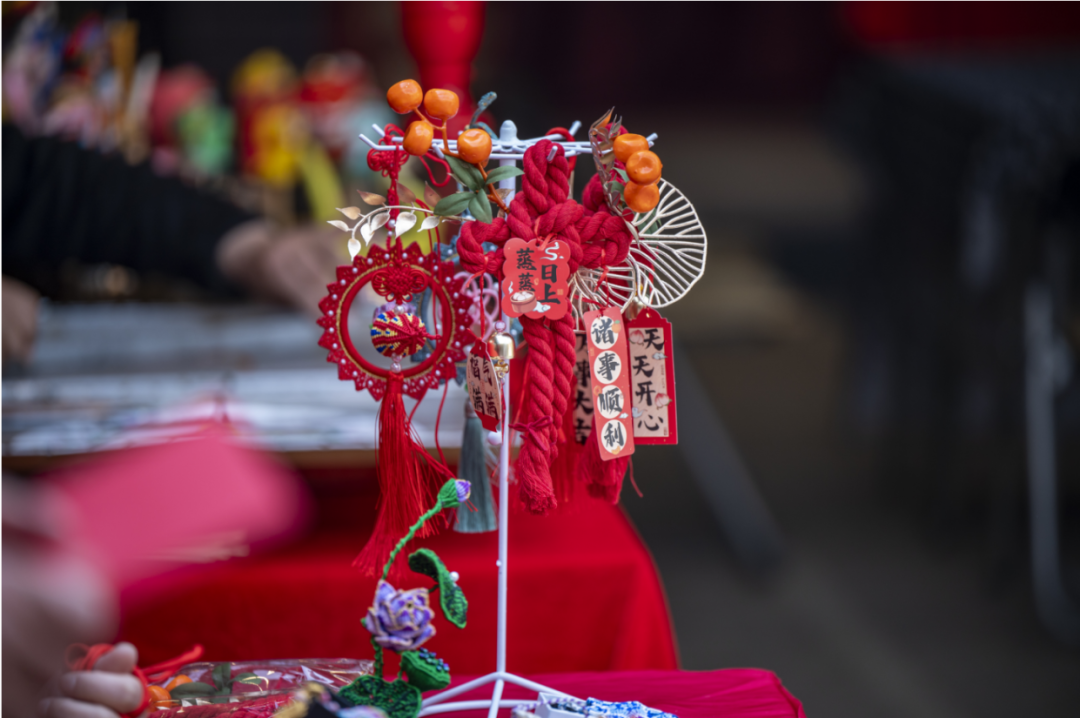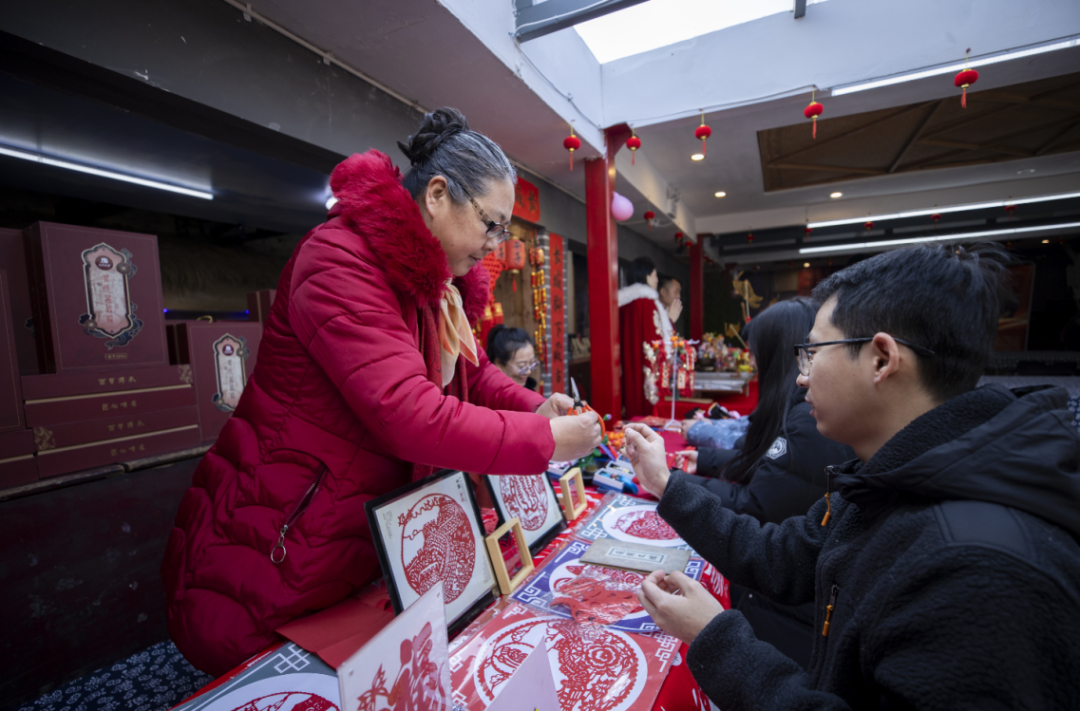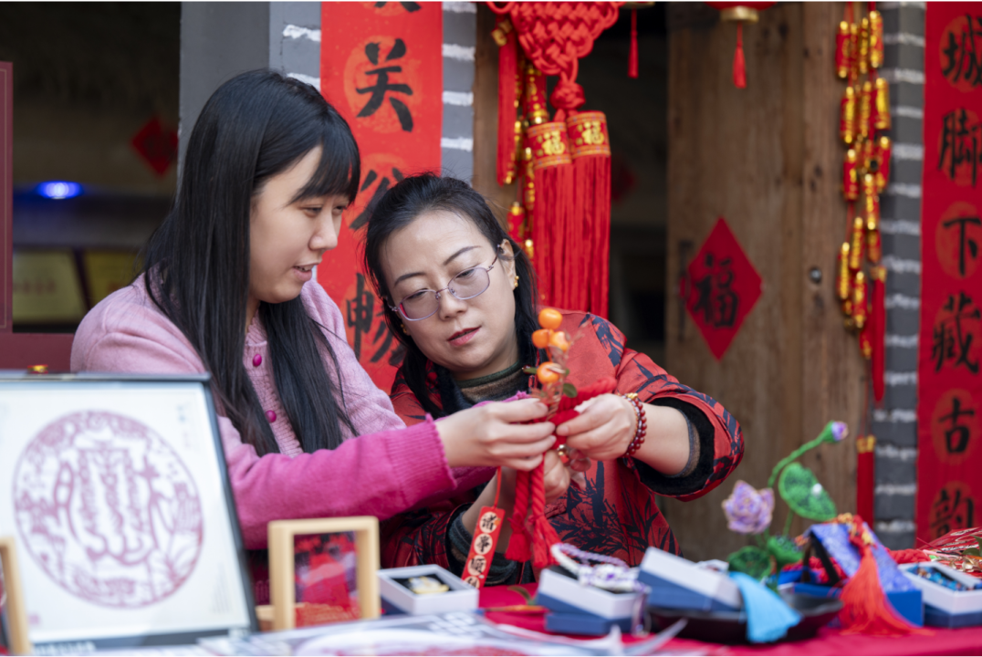在石峡村村史馆,精美的非遗剪纸、编结串珠琳琅满目,游客和非遗老师们一起剪刻窗花,体验编结串珠技艺,一幅幅蝴蝶窗花、一个个万字结......体现着大家对新春美好生活的祝福。另一边,面人、糖人等面塑非遗制作也吸引着游客们纷纷围观体验,在非遗老师的带领下,一个个可爱精致的面塑跃然眼前,承载着丰富的文化内涵,也寓意着美好的新春期盼。
