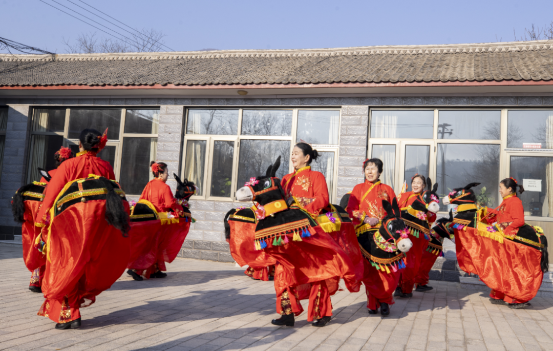 就餐期间,还有阵阵锣鼓声在院内响起。村民们自发组织的延庆传统秧歌——“跑驴”表演热闹非凡,石峡村的村民身着彩色服装,驾驭着小毛驴道具,欢快地奔跑,欢笑声不绝于耳。