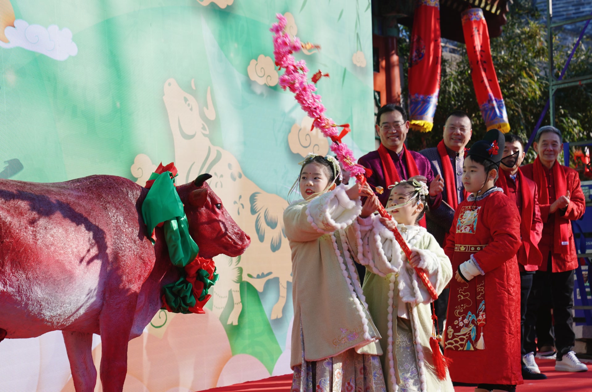 随后,北京古观象台台长宣布立春吉时,宣告新的一年开启。民俗专家刘惠民登台,以生动有趣的方式讲述了立春的历史渊源与文化内涵,引领现场观众领略古人对自然节气的智慧感悟。在身披彩绸的耕牛模型前,嘉宾和孩子们手持柳条、轻轻鞭打,口中念诵吉祥话语,祈愿风调雨顺、国泰民安,通过这一“鞭春牛”的古老仪式传递对美好生活的期盼与向往。