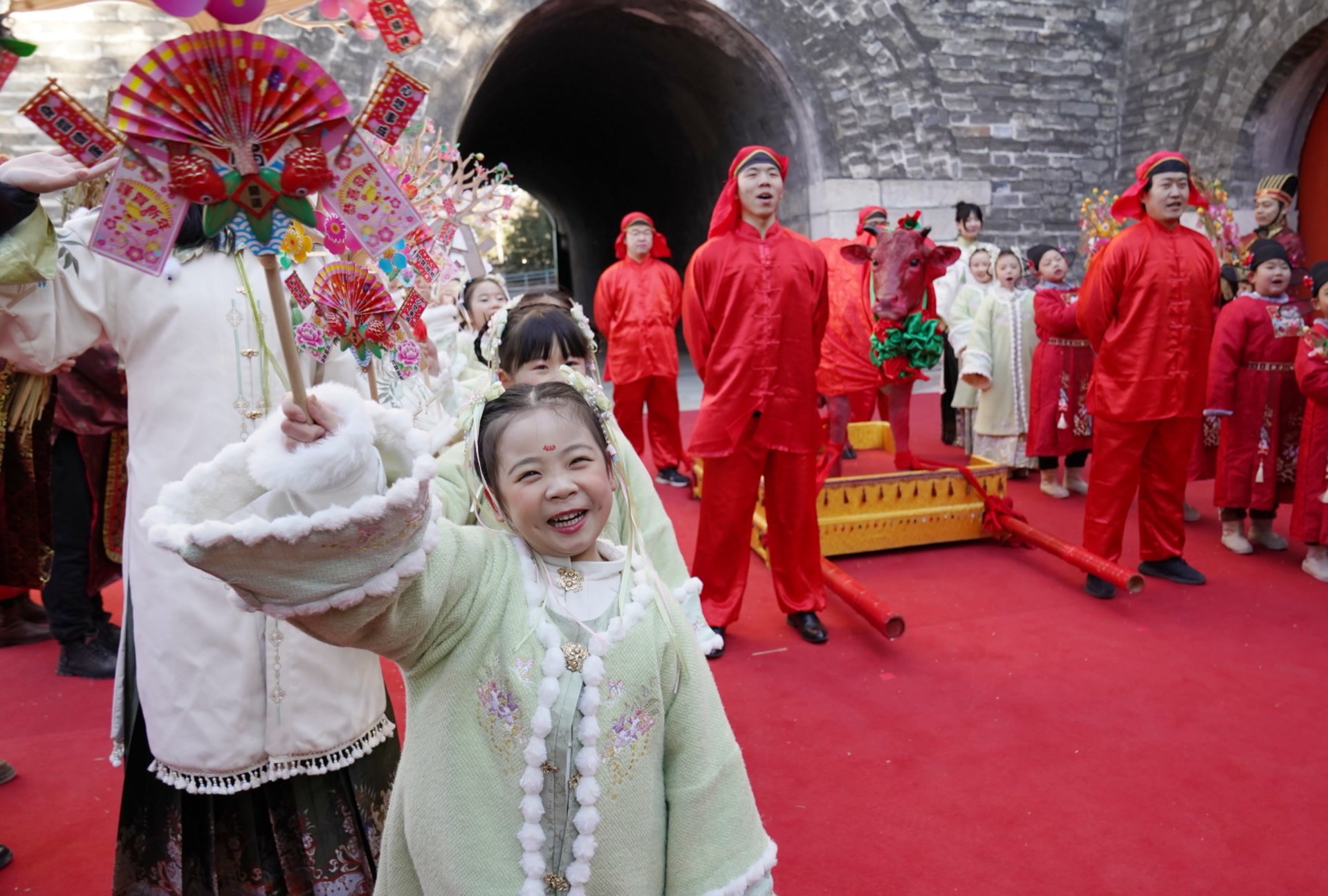 在当天上午的鼓楼院内“鞭春牛”民俗表演中,漏刻博士与司晨报春时、击鼓鸣钟表演、春神巡游、喊春、迎春牛、打春、舞台表演等一系列仪式活动接连上演,将古老的民俗仪式与现代化视觉结合起来,传递春的讯息。