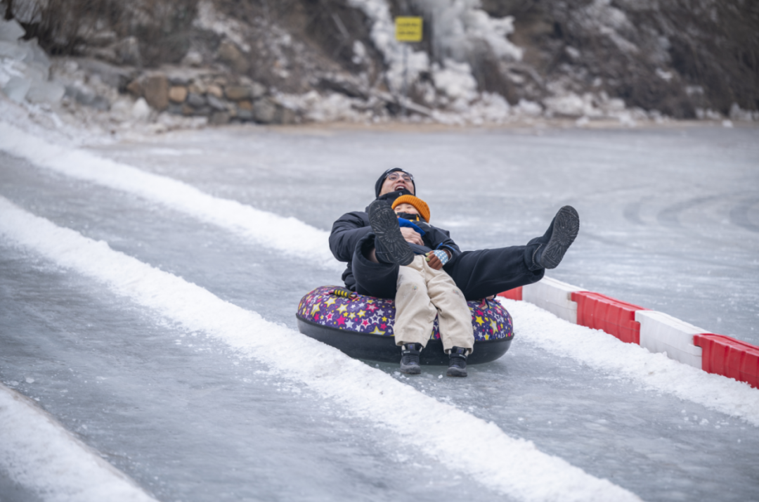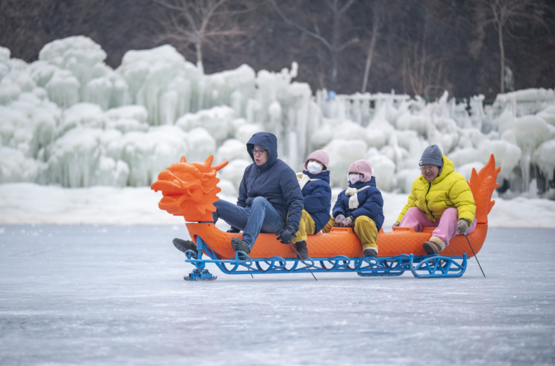 除了冰瀑餐厅外,景区还推出了众多冰上娱乐项目,如冰滑梯、小海豚滑冰、冰上油桶车、冰车、冰上龙舟、冰上自行车以及转转乐等。这些项目不仅适合成年人挑战刺激,更是小朋友们的最爱。游客们在冰上嬉戏打闹,欢笑声此起彼伏,为景区增添了欢乐的气氛。