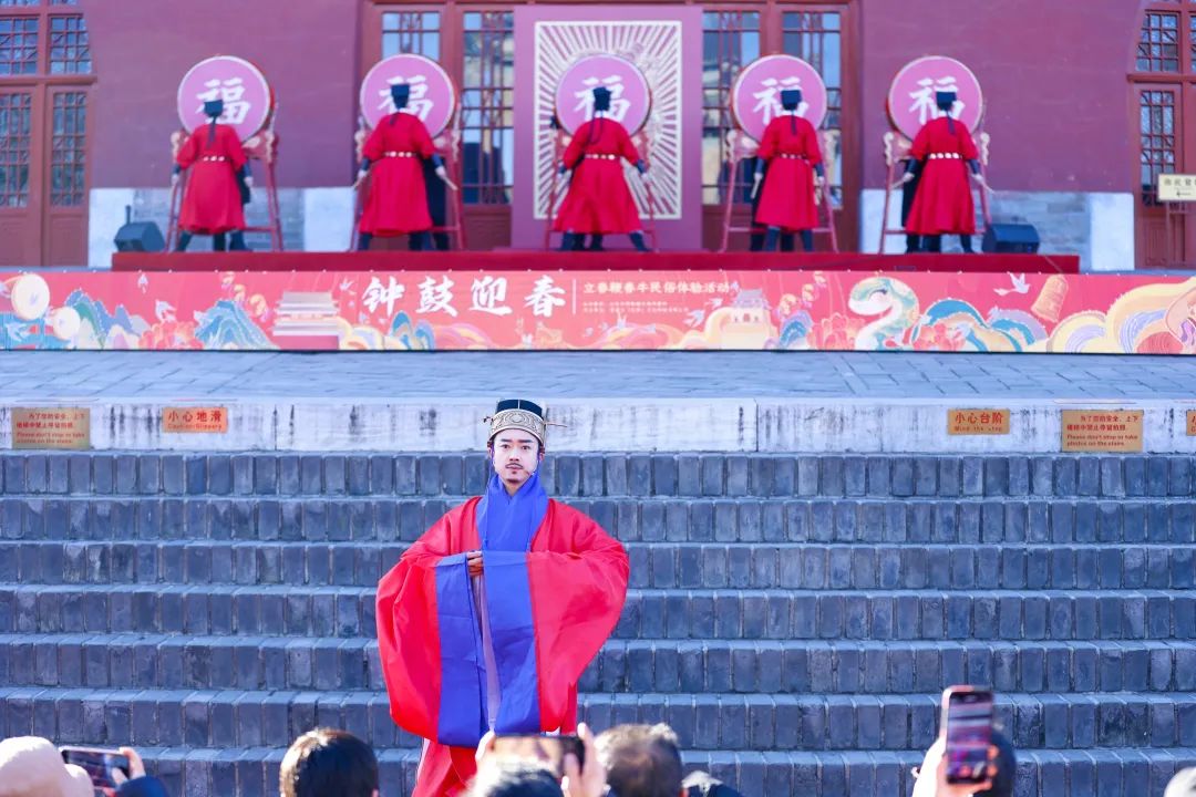 2025北京钟鼓楼“钟鼓迎春”活动在钟鼓楼广场举办。活动包含喊春、报春、打春、咬春、闹春舞台表演等系列仪式。在以往民俗活动基础上,增加漏刻博士与鸡唱官报春时、击鼓鸣钟表演等守正创新的环节,将古老的民俗仪式与现代化视觉呈现相结合。