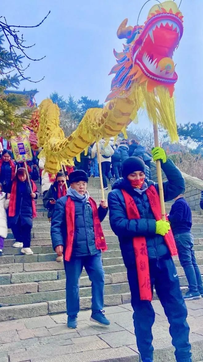 泰山,又名岱山、岱宗、东岳,有“五岳之首”“五岳独尊”“天下第一山”之称。孔子在这里“登泰山而小天下”,杜甫在这里留下“会当凌绝顶,一览众山小”的千古绝句。泰山被誉为中华文化史的一个局部缩影,自古就成为“国泰民安”的象征,是世界文化与自然双重遗产。可以说,泰山孕育了中华文明之光,镌刻着中华民族历史的印记,承载着千百年来中华民族美好的期盼,成为中华民族的精神文化之山。近两三年,泰山游客数量屡创新高,“泰山会制服每一个嘴硬的人”“青春没有售价,泰山就在脚下”等网络“爆梗”接连出圈,“特种兵”式陪爬、夜爬泰山成为当下新潮。春节期间,山东泰山景区为五湖四海的游客准备了丰盛的文化大餐,在泰山、岱庙、红门、天平湖等景点,锣鼓、舞龙舞狮、传统巡游、泰山皮影戏、泰山剪纸等非遗表演精彩纷呈。乙巳蛇年大年初三,记者登上泰山,感受泰山之巅的别样年味儿。