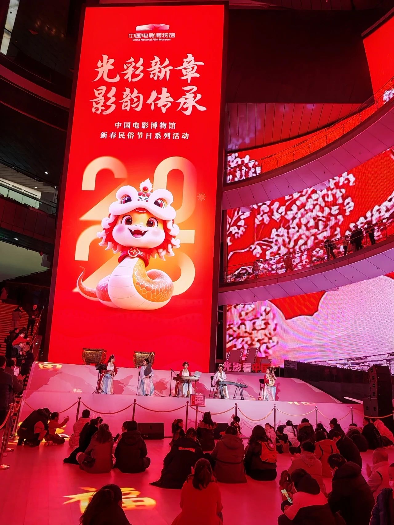 场馆入口处,红彤彤的门头装置上绘有蛇、鱼灯等吉祥图案,“光彩新章 影承艺韵”“新春快乐 蛇年大吉”等字眼格外醒目。中国电影博物馆一层、场外北广场等处,也设置了打卡新年拍照装置,以丰富的创意年味文化场景,营造喜庆祥和的新春佳节气氛。