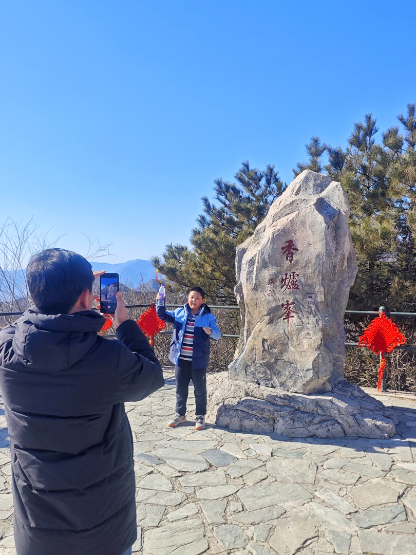 “终于到了,爸快给我拍张照片。”父子两人登顶后,家长为孩子拍照留念,期待新一年孩子茁壮成长。