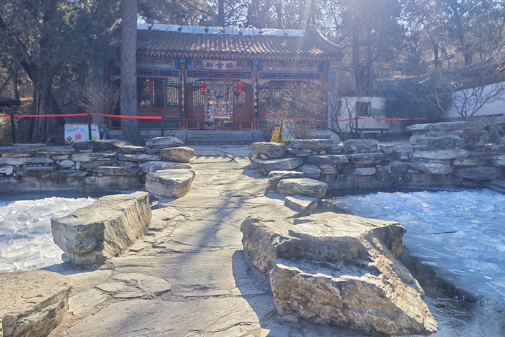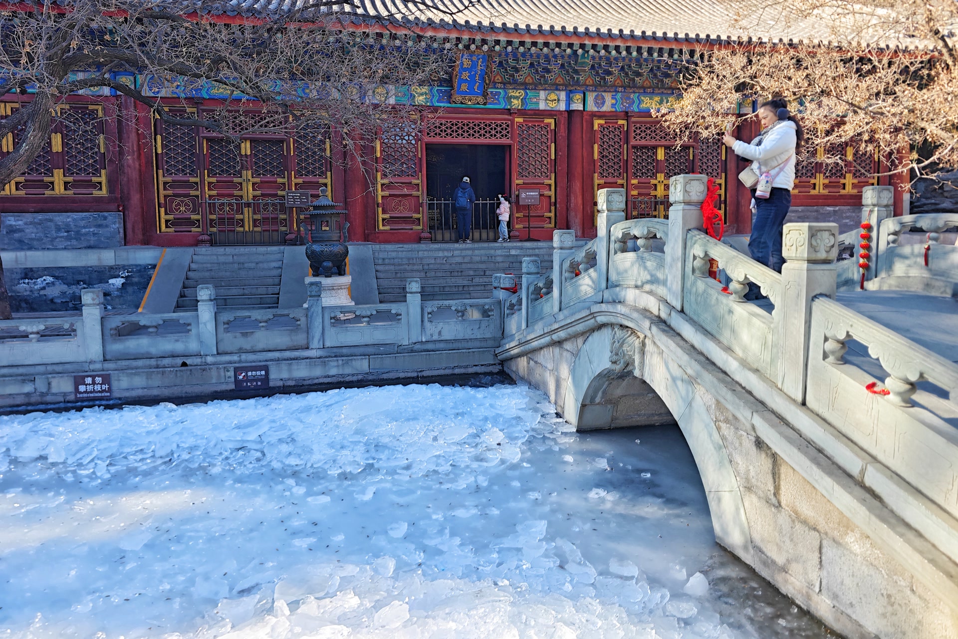 进入东门,勤政殿前的枫树虽已没有了秋日的风采,但结冰的水面有种别样的美。