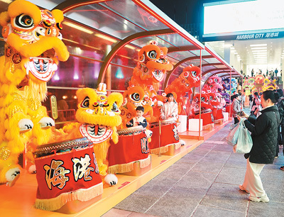 近日在香港维多利亚港畔,游客和醒狮合影。新华社记者 褚萌萌摄