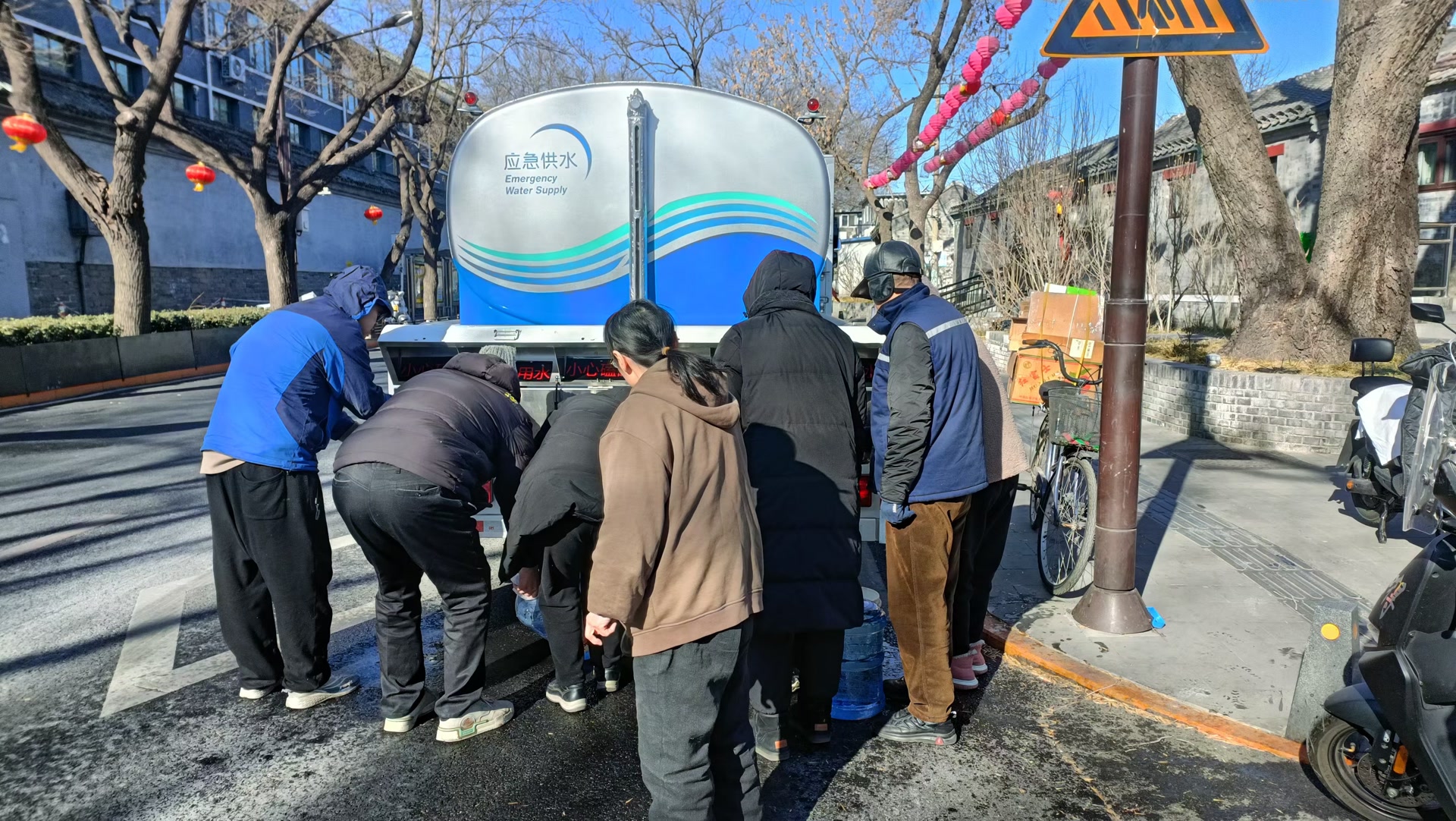 “早上8时,我们赶到现场时,自来水公司的工作人员已经在进行抢修了,派来的3辆供水车也已到位,环卫部门的工作人员正在清理路面上的结冰,保障胡同居民正常出行。”社区工作人员介绍,由于天气太冷,自来水公司派来的3辆应急供水车水流越来越细,龙头水管最后竟被冻住了。于是他们赶紧分头行动,一方面与自来水公司紧急协调其他供水车,另一方面回到社区烧水、接水,再运到现场,想缓解水管受冻的情况,但却无济于事。9时许,新调来的3辆应急供水车赶到现场,他们赶紧组织附近居民排队接水。社区工作人员还为两户高龄独居老人上门送水,直到12时30分许管道维修结束后才离开现场。