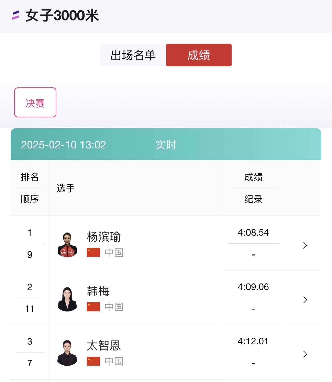在8日的女子1500米比赛中,韩梅、杨滨瑜、殷琦已经实现一次包揽。此次女子3000米比赛,中长距离新秀杨滨瑜凭借出色发挥,以4分08秒54的成绩夺冠。韩梅、太智恩获得亚军和季军。