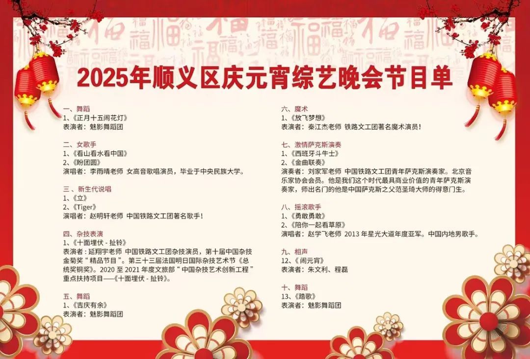 本次元宵综艺晚会由区委宣传部、区文化和旅游局共同主办,邀请中国铁路文工团与魅影舞蹈团两大艺术团联袂演出,节目涵盖歌舞、杂技、魔术、相声等多种形式,营造欢乐喜庆、祥和文明的节日氛围。