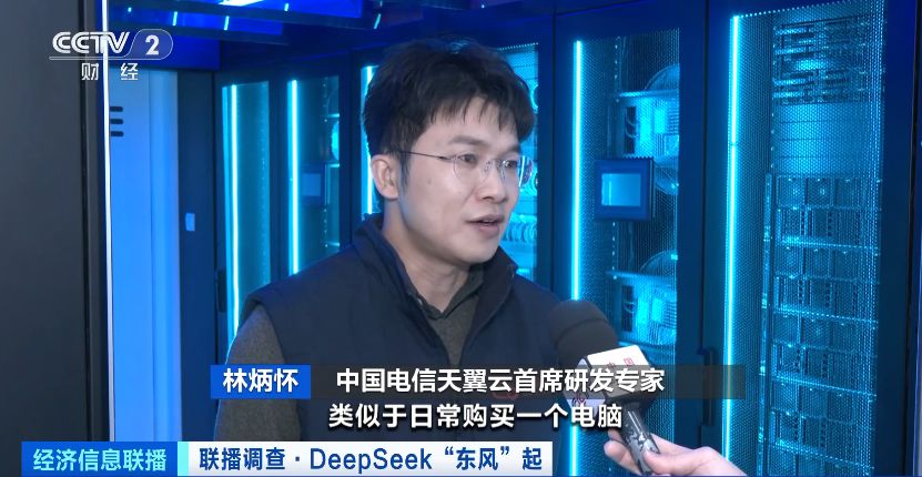 中国电信天翼云首席研发专家 林炳怀:用户无需云上去接入,类似于日常购买一个电脑,开箱就直接在企业里接入使用。国央企以及高校都有非常强烈的DeepSeek一体机需求。