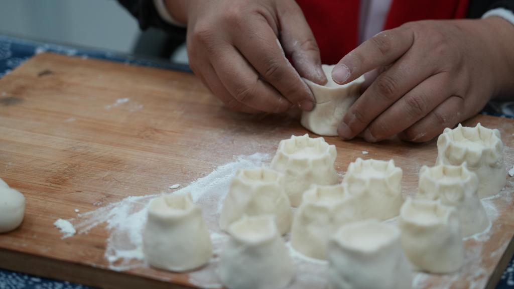 “今天我们用的材料是小麦粉,做出来的面灯是白色的,叫作‘银灯’。如果用玉米面,做出来黄色的面灯,就叫‘金灯’。还有用荞麦面做的‘铁灯’。”梁军说,面灯面塑历史悠久、传播地域广泛、种类繁多,他教记者制作的是代表月份的面灯面塑。只见梁军将面团捏成灯台的形状,又在边缘捏出小角,有几个角就代表几月。如果有闰月,就要多做一个对应月份的面灯。塑形完成后,梁军在面灯中央插入灯芯,把面灯放入蒸锅。