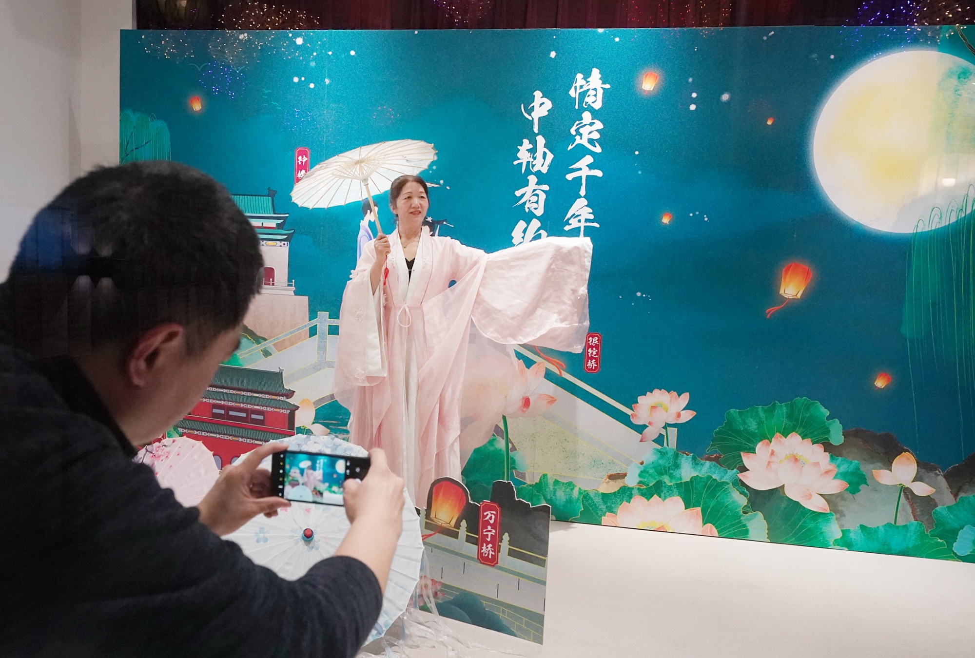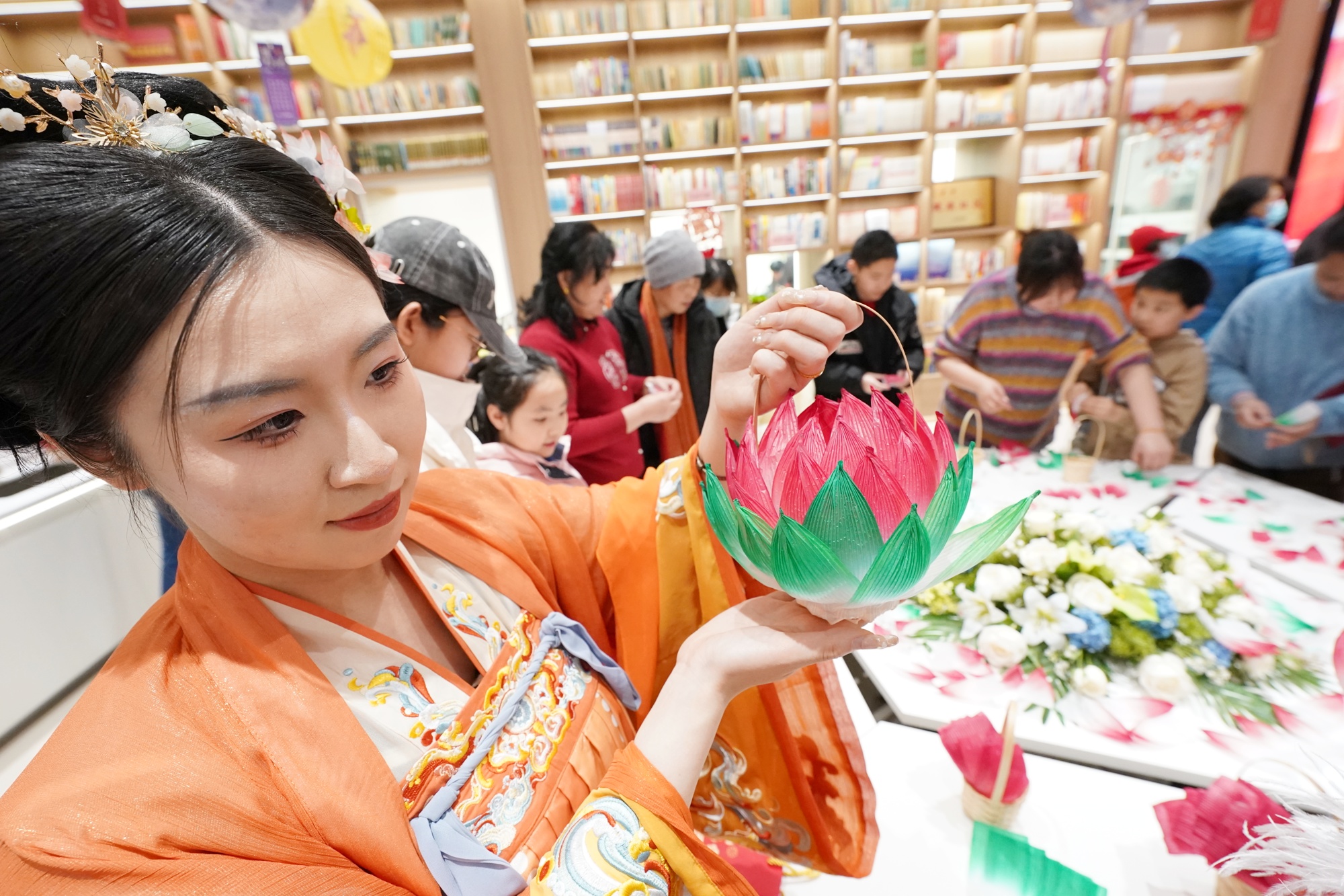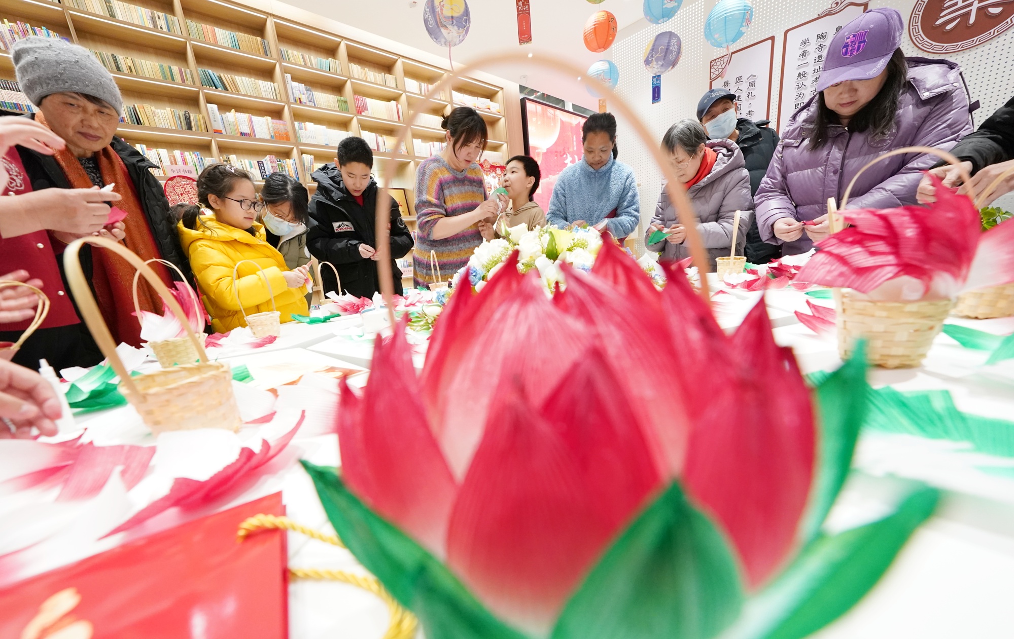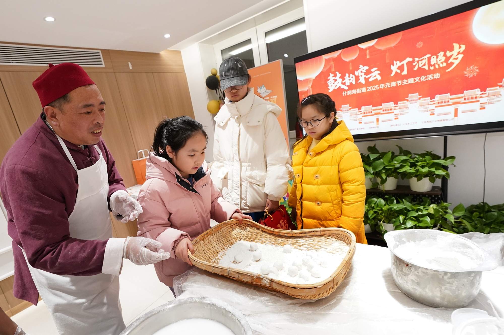 活动现场,观花灯、猜灯谜,居民跟随民俗老师做莲花灯,体验摇元宵,身着传统服饰打卡留念,沉浸式感受中轴文化的独特魅力。