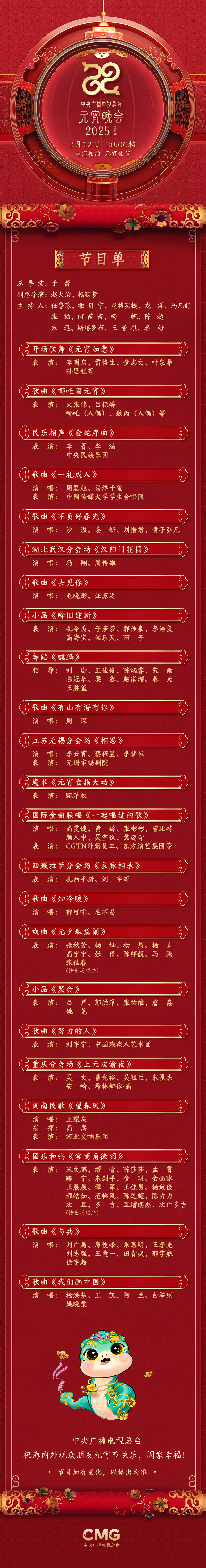 今晚8点档,中央广播电视总台《2025年元宵晚会》将在央视综合频道(CCTV-1)、综艺频道(CCTV-3)、中文国际频道(CCTV-4)、音乐频道(CCTV-15)以及4K超高清频道、8K超高清频道等电视频道,音乐之声、经典音乐广播、文艺之声、粤港澳大湾区之声、台海之声、华语环球广播、南海之声等广播频率,央视新闻、央视频、云听客户端、央视网、央广网、国际在线等新媒体平台,以及“百城千屏”8K超高清传播平台同步播出。