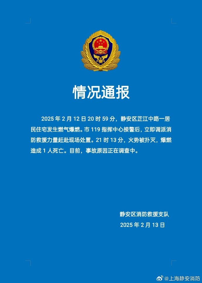 上海静安消防凌晨通报:一居民住宅燃气爆燃,造成1人死亡
