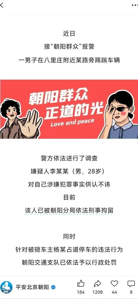据“平安北京朝阳”发文,因公共停车位一前车不规范停放影响同行人停车,李某某借着“酒劲”踢车门、抠车标、踹掉反光镜……砸车毁财涉嫌犯罪,目前李某某已被依法刑事拘留。