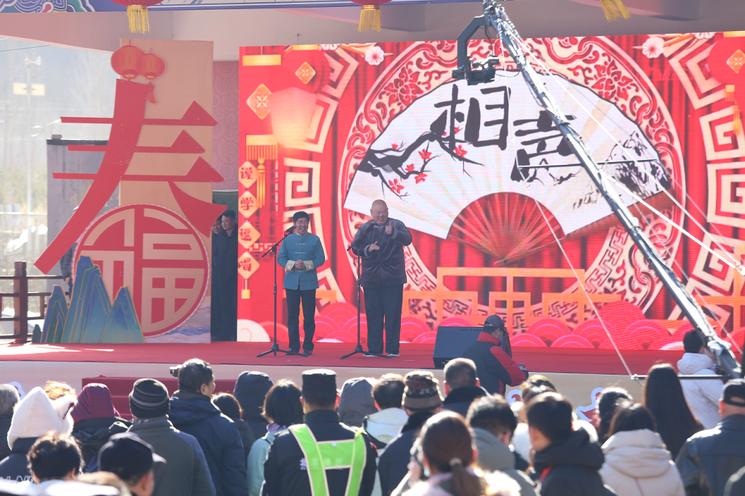 小车会、舞龙舞狮、大鼓、相声等节目轮番游场,现场观众笑声不断,掌声连连。