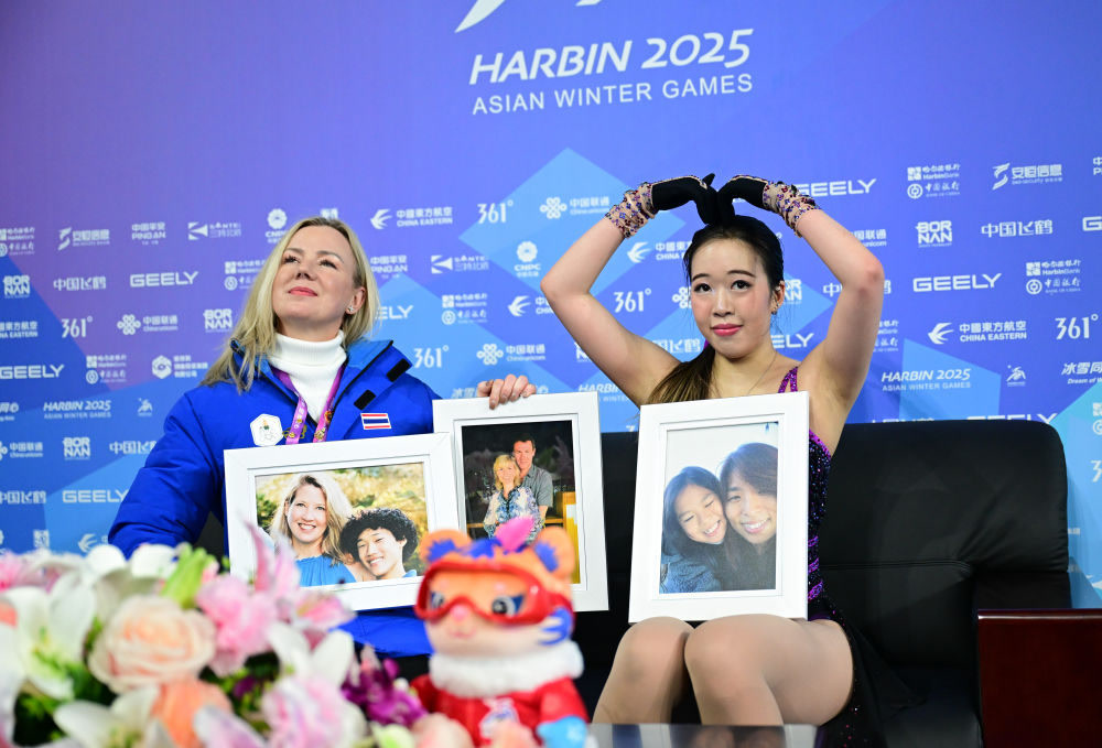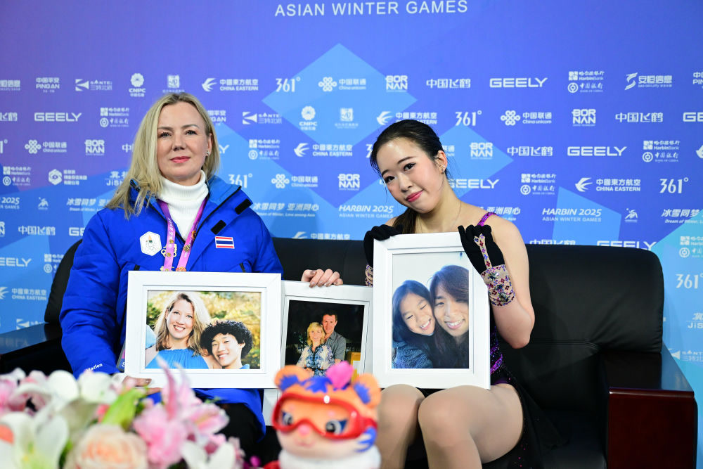 泰国花滑选手提克里·实帕阿差在等分席和教练一起手持遭遇空难的美国花滑运动员照片。“我仍然无法接受这一切,我想在国际舞台上纪念他们,我想让每个人都知道,我是在为他们而战。他们和我在一起,我带着他们的力量,我要为他们而继续滑冰。”