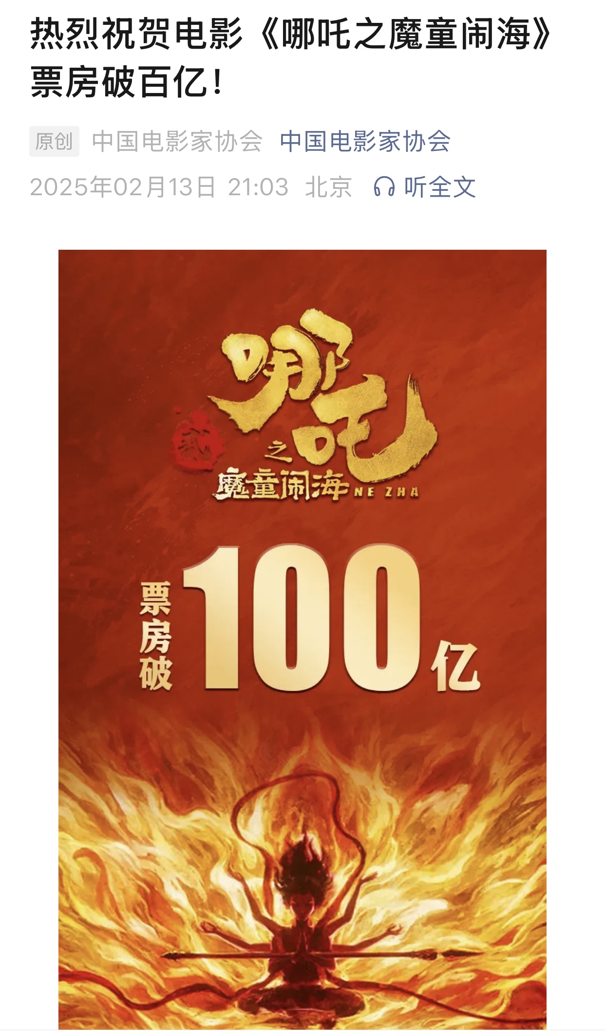 随后,中国电影家协会发文恭喜,文中写道:“这部作品创造了票房奇迹,弘扬了中华优秀传统文化和时代精神,创新了当代中国电影形态,彰显了中国电影人不懈努力的艺术追求,极大提振了电影界信心。《哪吒》的荣耀,是中国电影的高光时刻,更是中国电影从高原迈向高峰的重要时刻。我们坚信,在电影人与观众的双向奔赴中,中国电影必将以更蓬勃的创造力、更开放包容的姿态,开创更加美好的未来。”