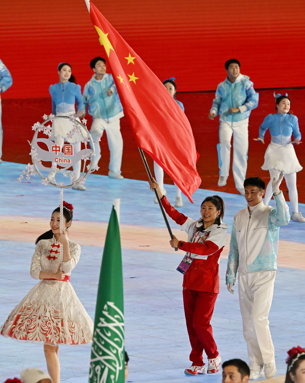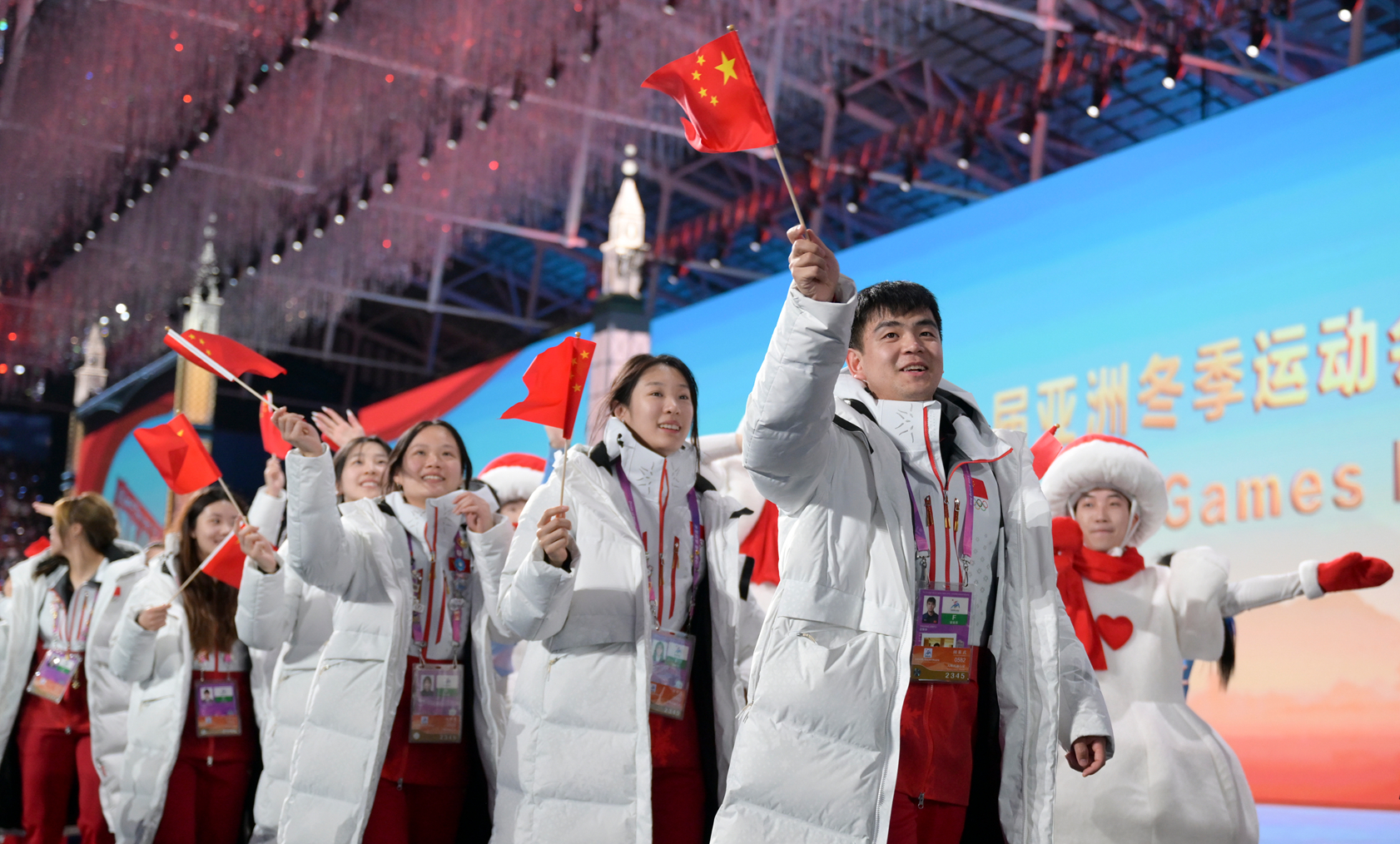 闭幕式上,中国体育代表团挥舞着国旗步入现场,热烈的欢呼声响彻哈尔滨国际会展体育中心。本次亚冬会,中国体育代表团170名运动员参加了全部64个小项的比赛,是我国亚冬会参赛历史上规模最大、人数最多的一次。会场内,中国运动员手拉手围成一个同心圆,阳光昂扬的面貌感染着每一位观众。