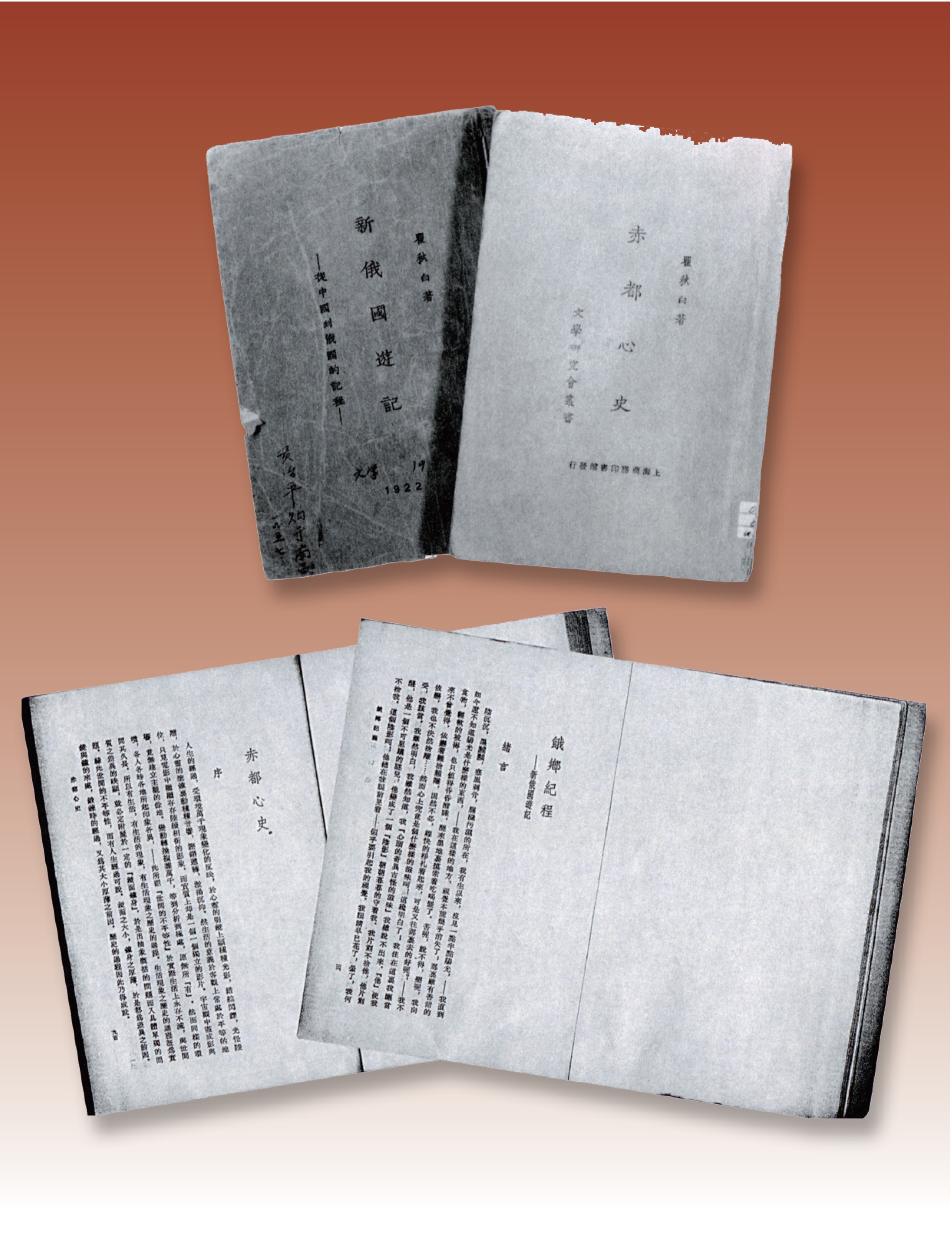 1921年2月16日,瞿秋白开始撰写散文集《赤都心史》第一章《黎明》。他所创作的《新俄国游记》《赤都心史》最早向国内介绍了世界上第一个社会主义国家苏俄革命初期的情况,并记录了他自身受十月革命影响成为共产主义者的思想历程。图为《新俄国游记》《赤都心史》。