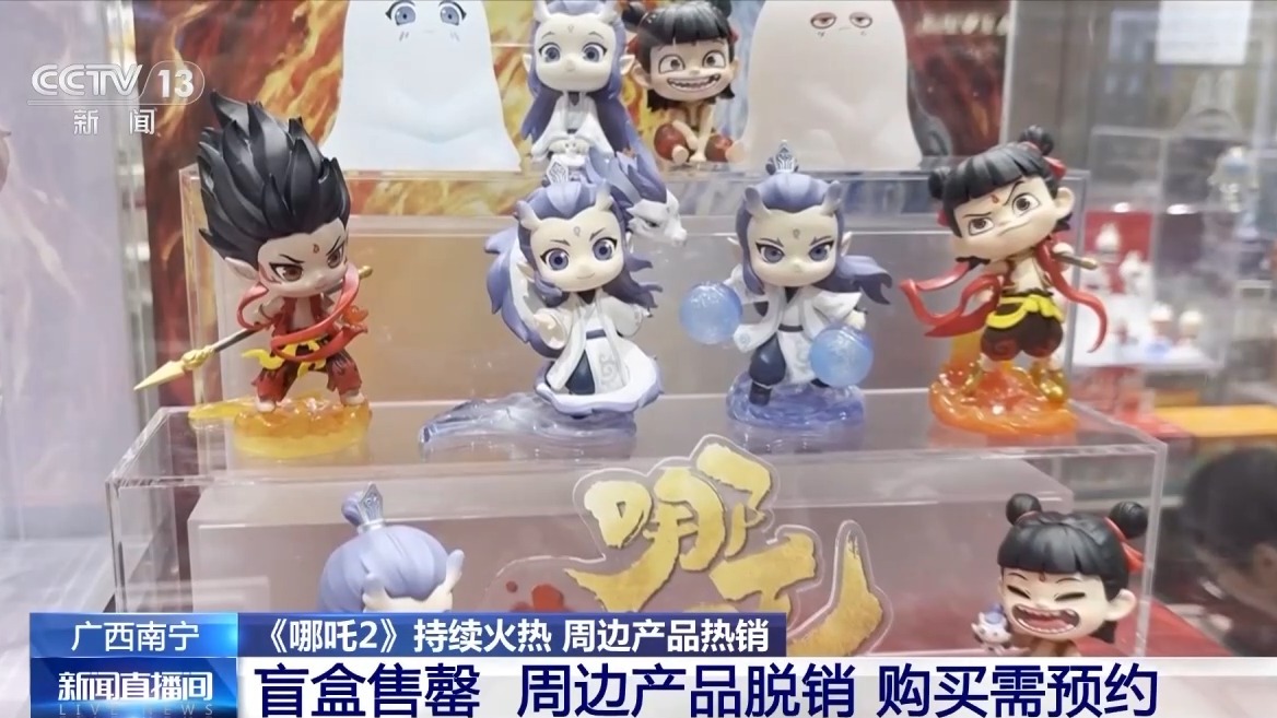 在广西南宁市的一家授权品牌潮玩门店,店员介绍,《哪吒2》的周边盲盒早已售罄,目前暂无补货,建议顾客扫码预约、购买。另一家潮玩店的店员也表示,和电影有关的周边产品已经全部脱销。