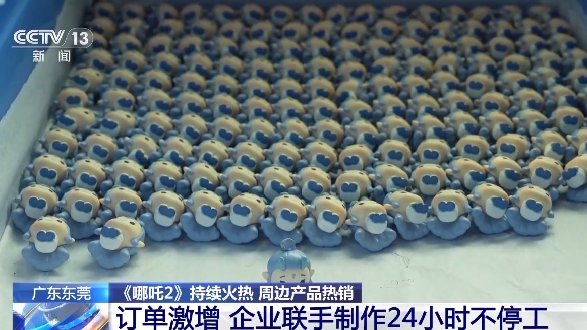 为了满足消费者对于《哪吒2》周边产品的火热需求,广东东莞的授权潮玩企业开启“24小时智造模式”。在一家公司的生产车间,工人们正在流水线上快速分拣零件,经过十几道手工组装工序后,《哪吒2》周边产品迅速成型。