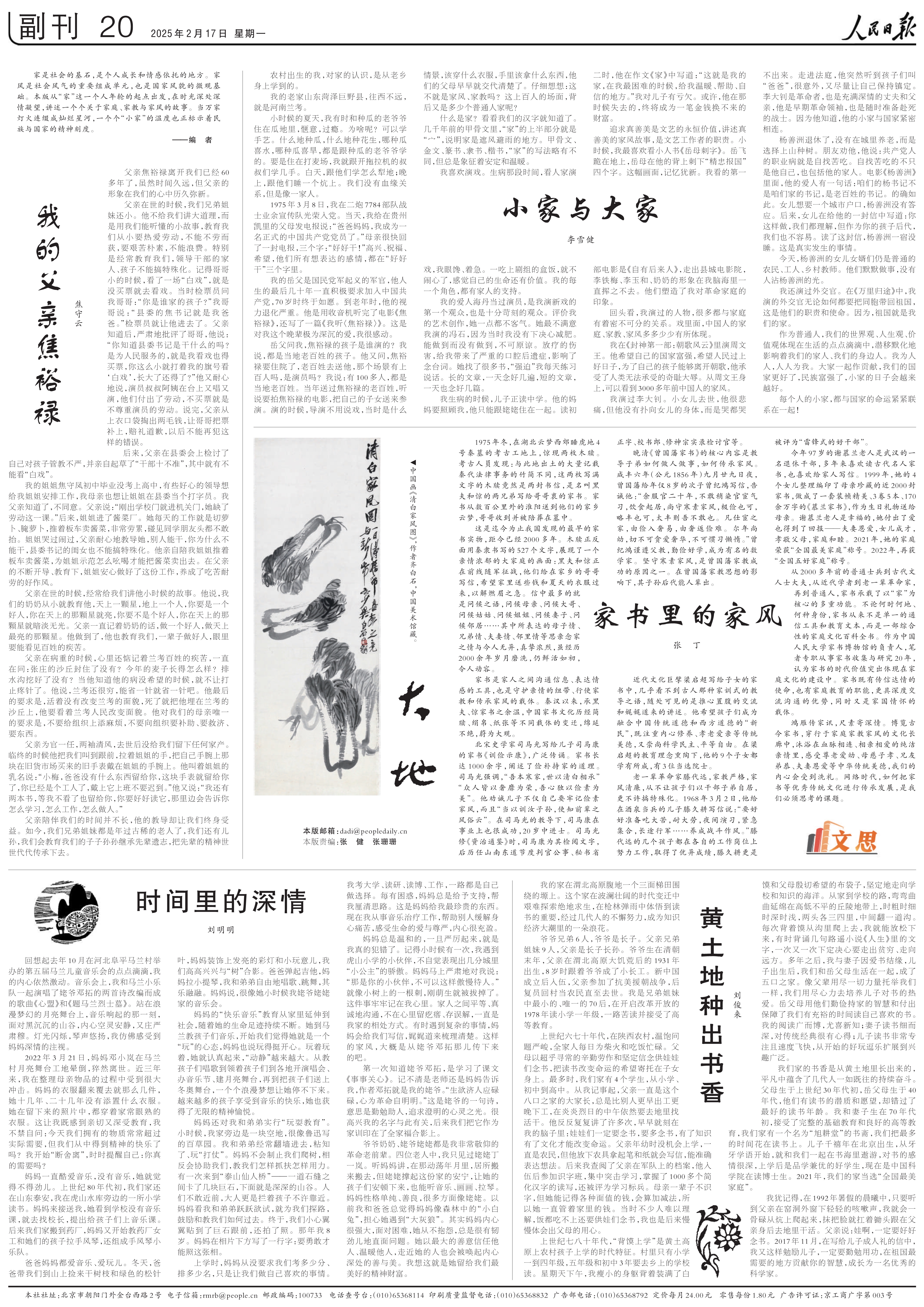 家是社会的基石,是个人成长和情感依托的地方。家风是社会风气的重要组成单元,也是国家风貌的微观基础。本版从“家”这一个人年轮的起点出发,在时光深处深情凝望,讲述一个个关于家庭、家教与家风的故事。当万家灯火连缀成灿烂星河,一个个“小家”的温度也正标示着民族与国家的精神刻度。