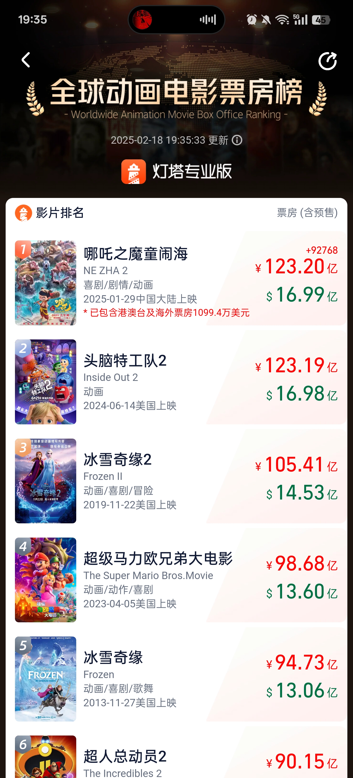据灯塔专业版数据显示,截至2月18日晚,影片《哪吒之魔童闹海》上映第21天,全球票房(含预售)突破123.19亿元人民币,登顶全球影史动画电影票房榜!同时也进入全球影史票房榜前8位。其中,内地票房(含预售)超122亿元,大幅刷新全球影史单一市场票房纪录,影片海外票房达1099.4万美元,同样表现出色。