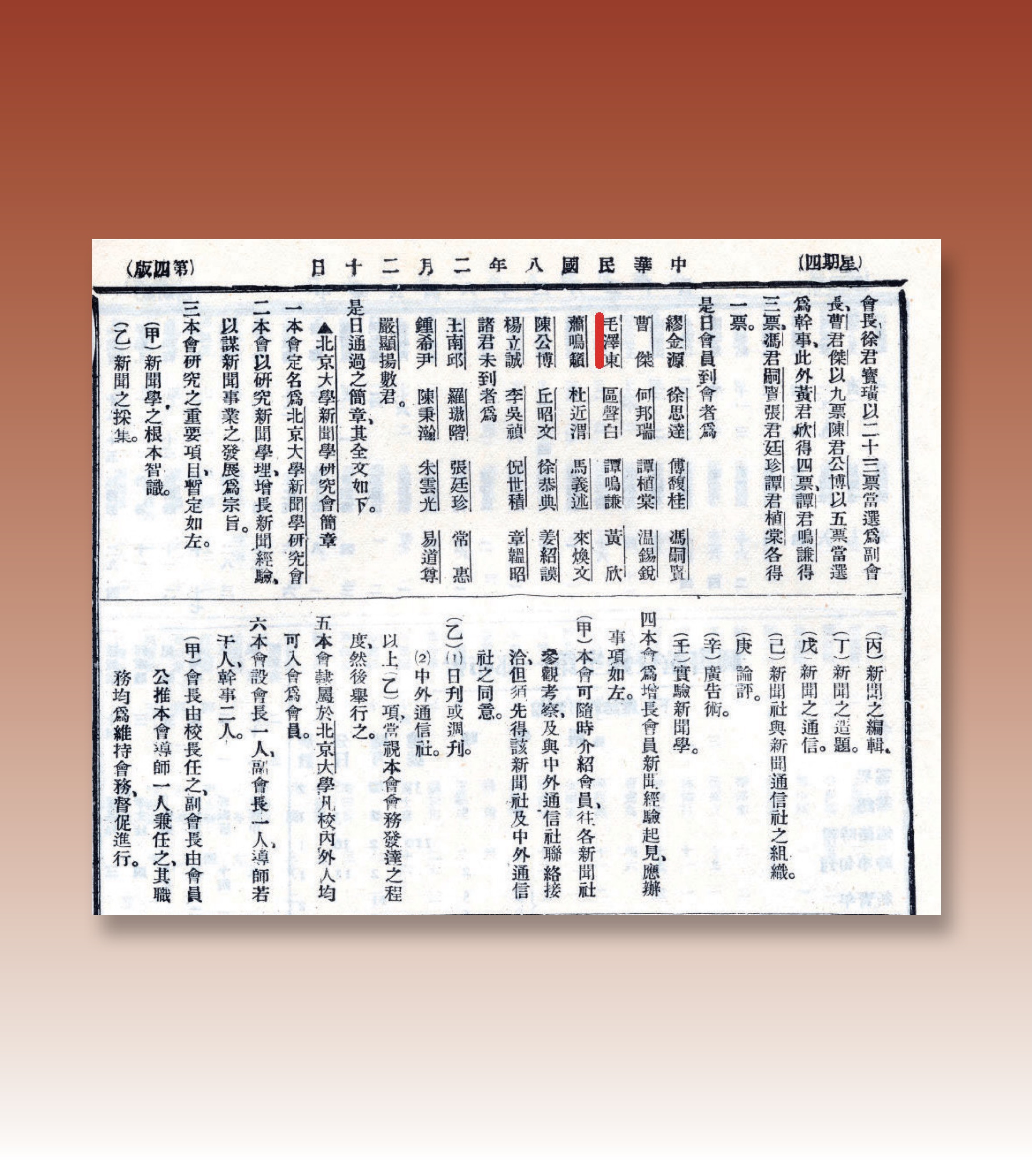 1919年2月19日,北京大学新闻学研究会在文科第34教室开改组大会,毛泽东是出席大会的24名会员之一。大会修正通过简章:(一)本会定名为北京大学新闻学研究会;(二)本会以研究新闻学理、增长新闻经验,以谋新闻事业之发展为宗旨;(三)本会研究之重要项目:新闻学之根本知识、采集、编辑、选题、通信等;(四)本会隶属于北京大学,凡校内外人均可入会为会员等十条。图为《北京大学日刊》上刊载的会议记录。