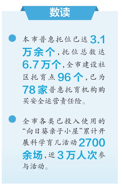 本市大力推动普惠托育服务发展。市卫健委日前介绍,本市普惠托位已达3.1万余个,全市建设社区托育点96个,已为78家普惠托育机构购买安全运营责任险。