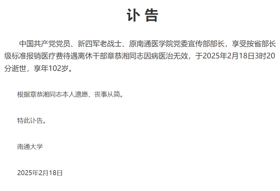 据《南通日报》消息,2025年2月18日,南通大学发布讣告: