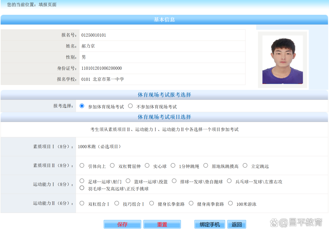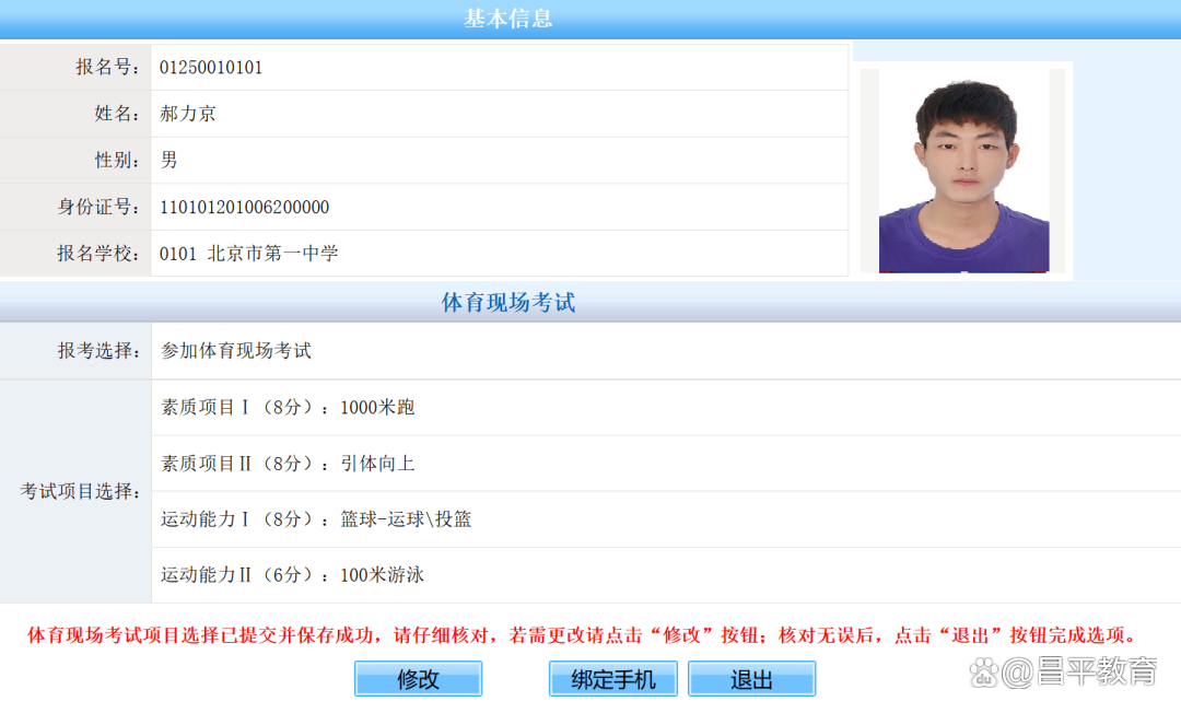 1.预览页面显示考生已经提交并保存成功的体育现场考试报考选择和考试项目选择信息,请考生认真核对。