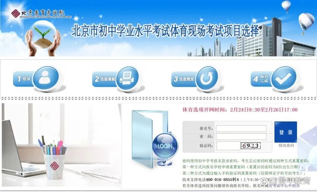 考生登录北京教育考试院网站(www.bjeea.cn,浏览器建议使用IE11、360极速浏览器、谷歌浏览器),点击“公告栏”下“2025年北京市初中学业水平考试体育现场考试项目选择”,进入“北京市初中学业水平考试体育现场考试项目选择”登录界面。