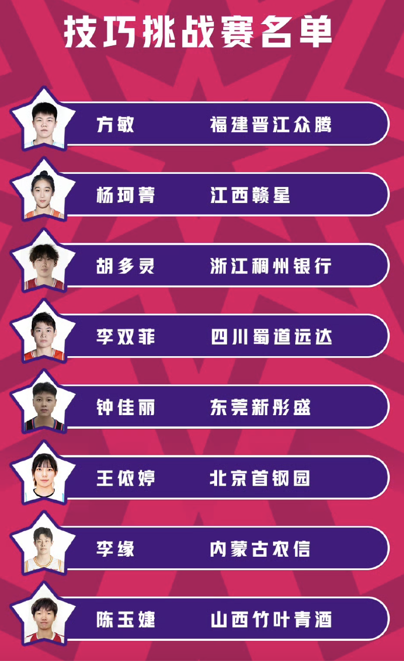 星锐赛中场休息时段将进行三分球大赛和技巧挑战赛的预赛,北京首钢园女篮队员王依婷将参与技巧挑战赛。技巧挑战赛预赛共八位选手,参赛球员两两对决,从右侧底线出发,运球绕桩至左侧传球点传球,球通过目标球洞后,在传球点旁拿球运球至右侧篮下上篮,最后运球至左侧三分线投三分,率先命中三分的球员获胜,4名胜者晋级决赛。