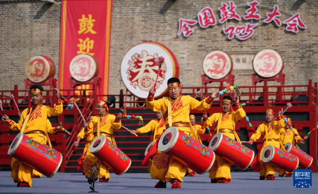 2月22日,民间锣鼓队在正定古城南城门下参加2025年全国鼓王大会展演活动。新华社发(闫志国摄)