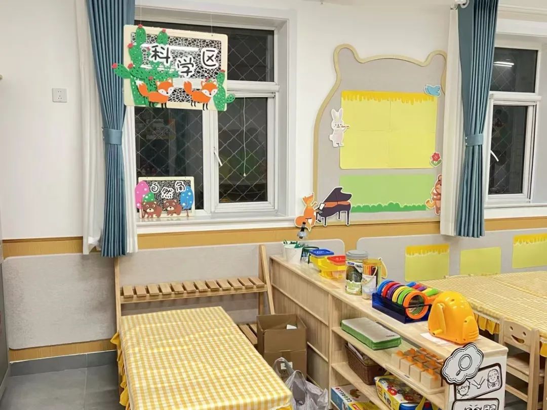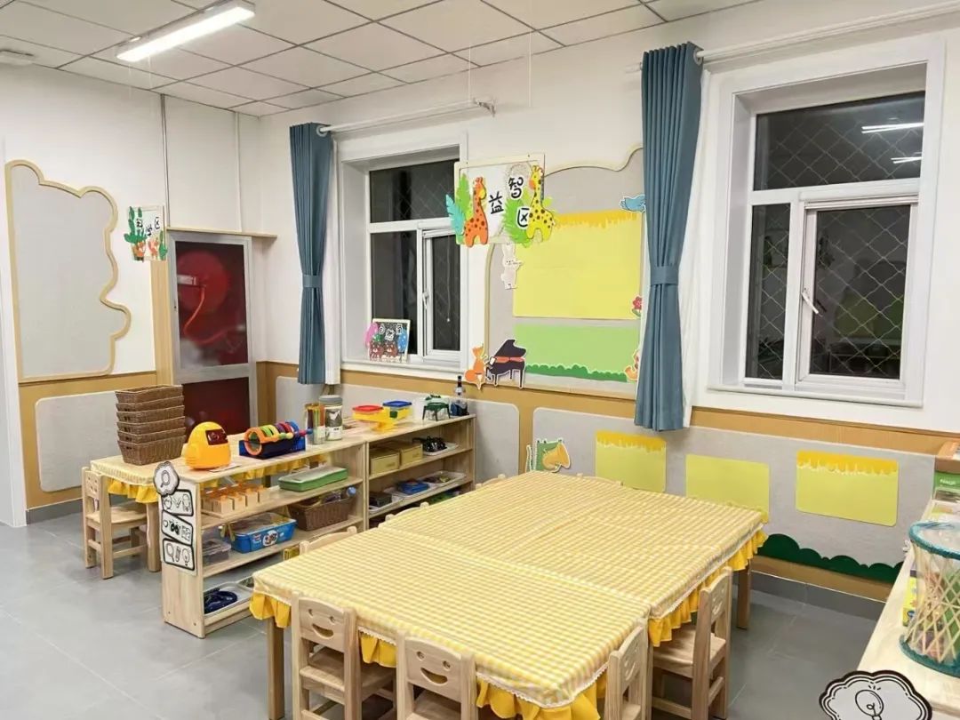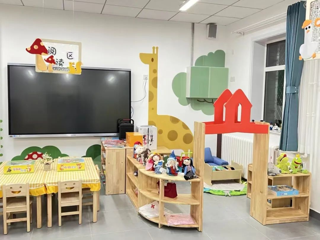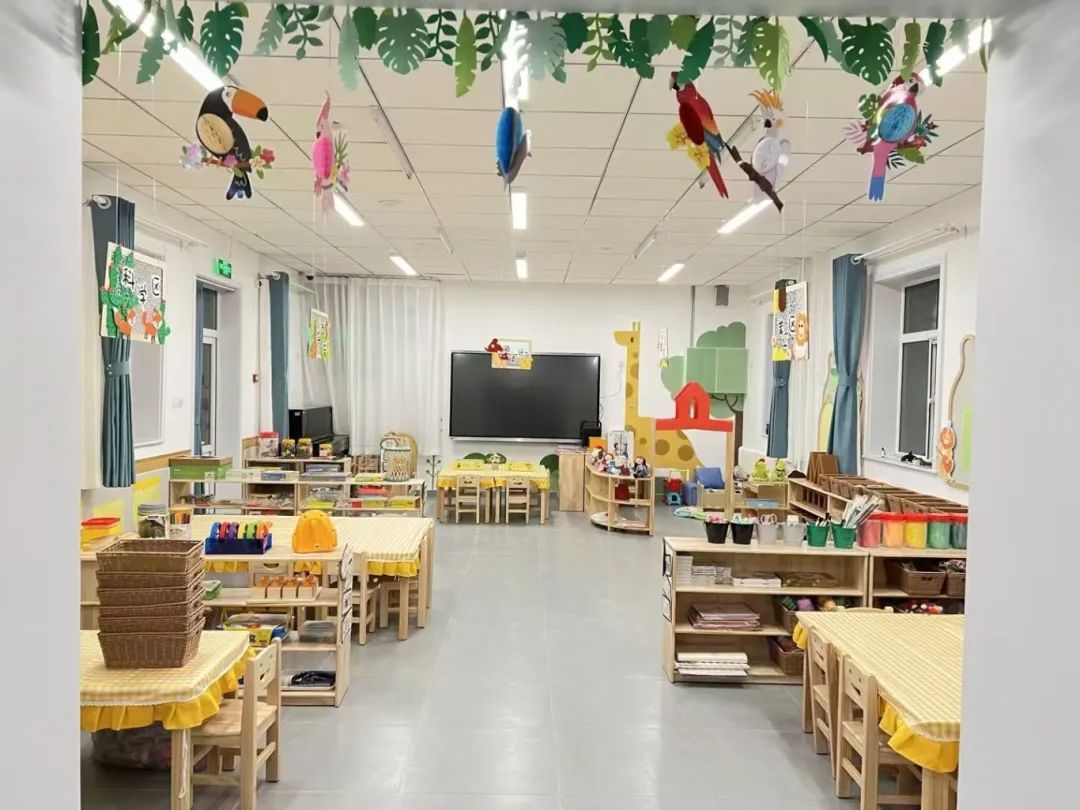 教室内的教学一体机、音响、图书、玩教具等设备一应俱全,能够为幼儿提供多样化的学习体验。此外,室内还设置了多个功能区,如阅读角、手工区、角色扮演区等,为幼儿提供了多场景的生活互动体验,帮助他们在游戏中学习、在探索中成长。