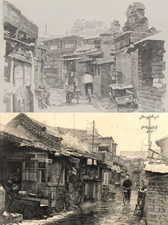 他把手指粗的铅笔磨出刻刀一样的宽面,直笔、横笔、偏锋、点彩,凹凸有序、层次分明地绘制出坑洼的墙壁、蓬松的雪花、婆娑的树影和极富年代感的行人,开创了用扁平宽的铅笔线条勾勒胡同风貌的独特画法。