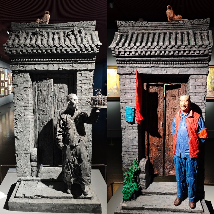 “古城之忆”展览中,中央美术学院雕塑系老师柳青的作品很有意思。正面看是提笼架鸟、戴着瓜皮帽的老人,反面看是笑逐颜开、穿着红马甲的大爷……穿越时空的,是不变的青砖黛瓦和屋顶上伸懒腰的猫。