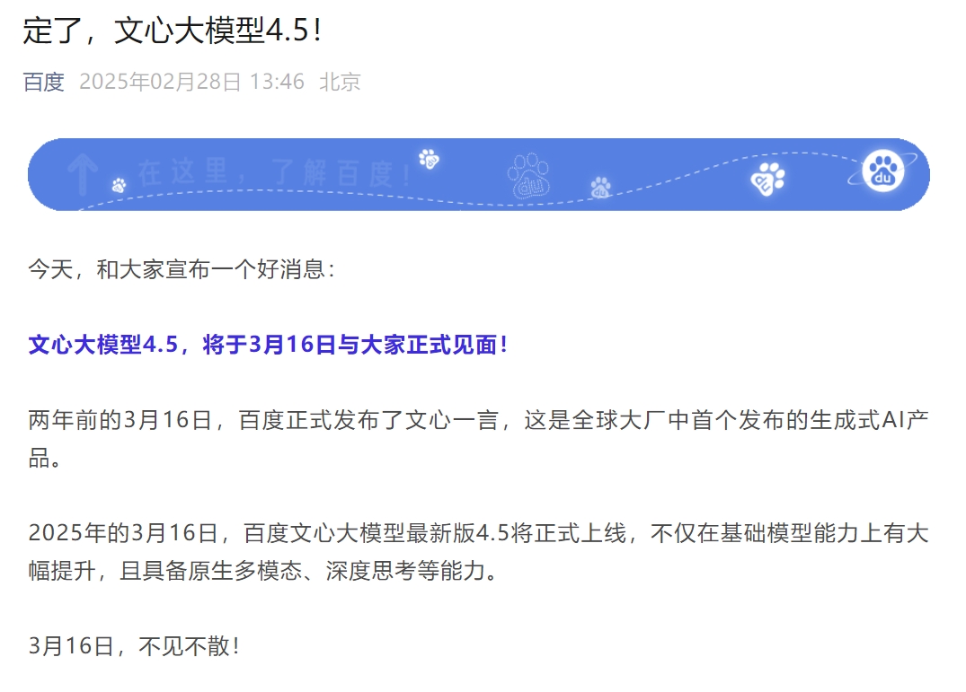 据百度官微消息,2025年的3月16日,百度文心大模型最新版4.5将正式上线,不仅在基础模型能力上有大幅提升,且具备原生多模态、深度思考等能力。