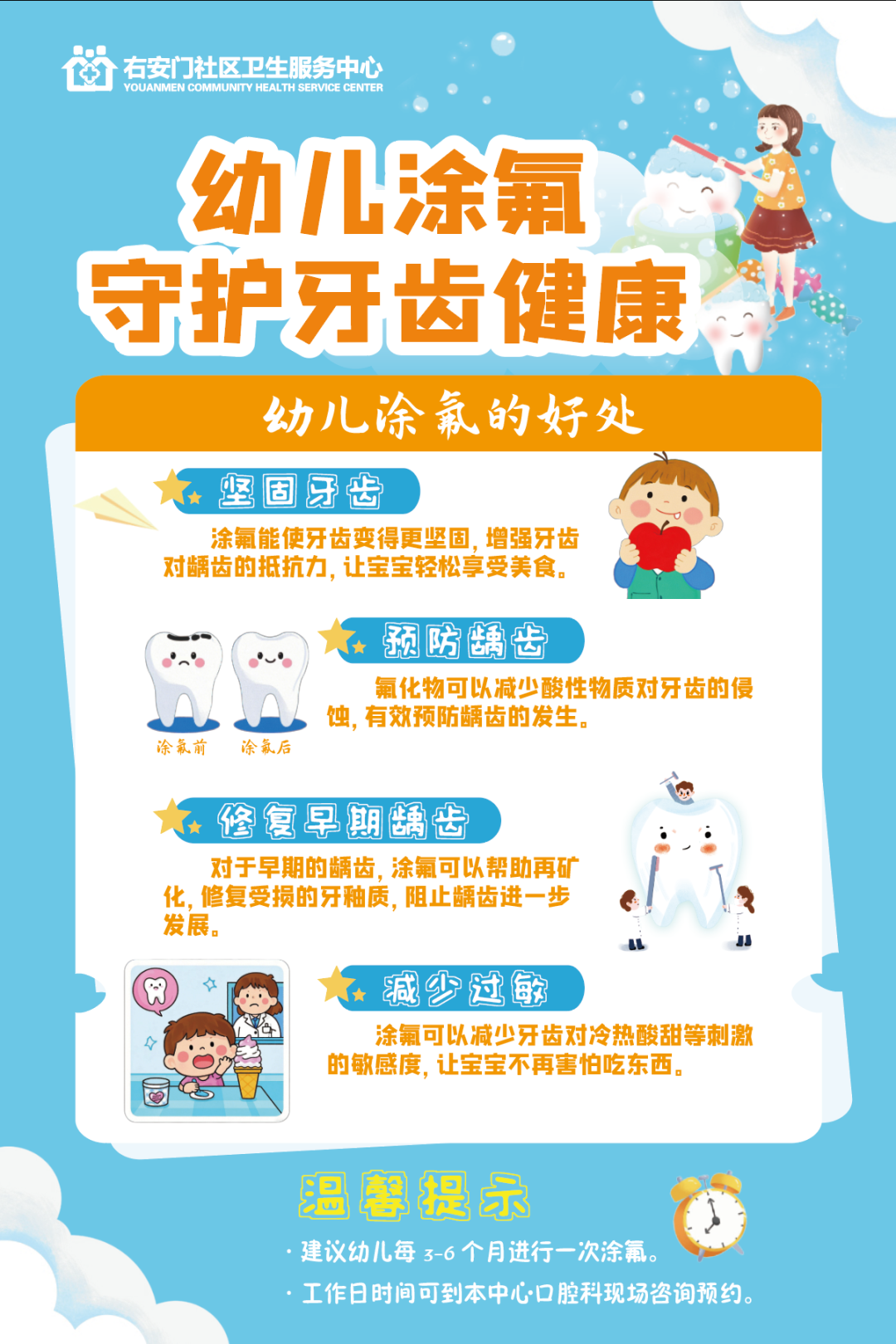 欢迎前往右安门社区卫生服务中心口腔科现场预约咨询,期待为您的孩子的口腔健康保驾护航!