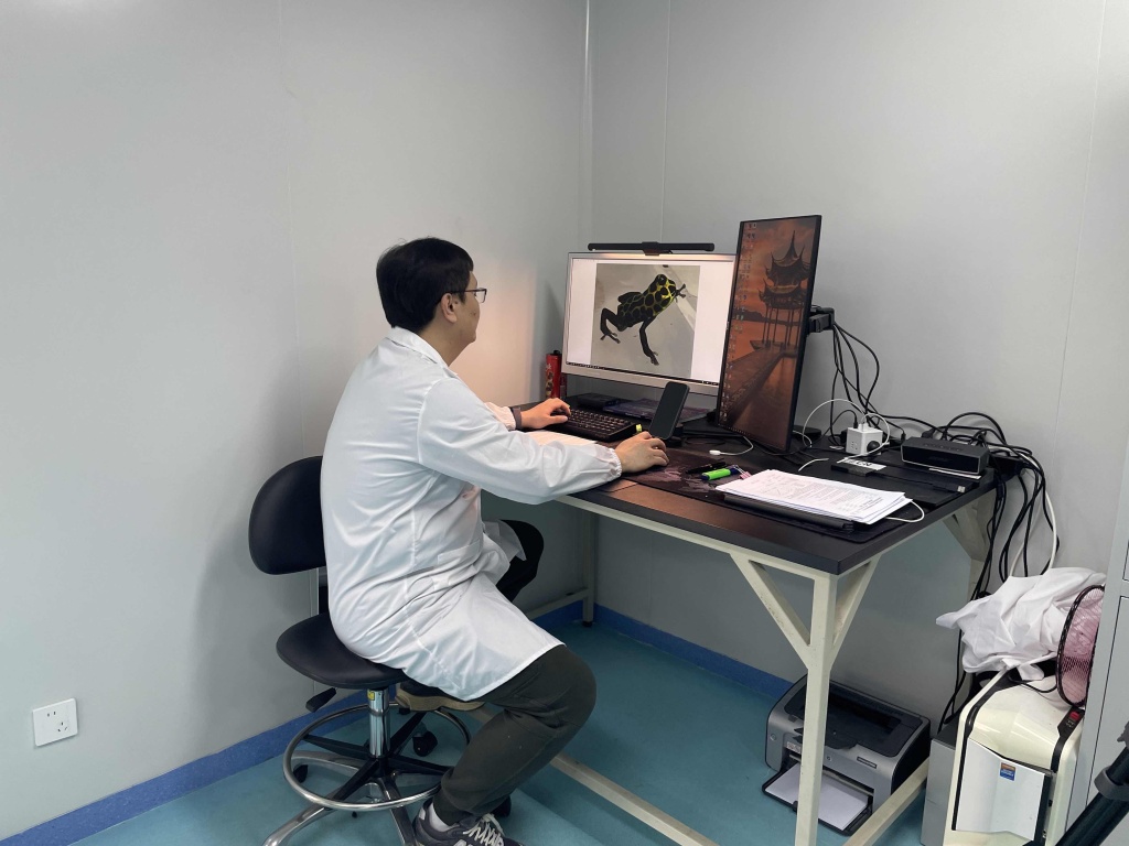 “如果采集它的哪怕很小一块组织,它基本就活不了了。”蔡一村说,箭毒蛙属于濒危物种,他希望在不破坏它们身体、确保其存活的前提下,采集足够的形态学特征信息,优先用形态学方法进行初步辨认。